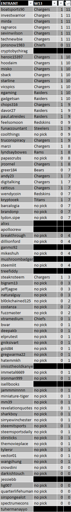 Here is a chart for only week #13 results and the total score so it's easier to read.