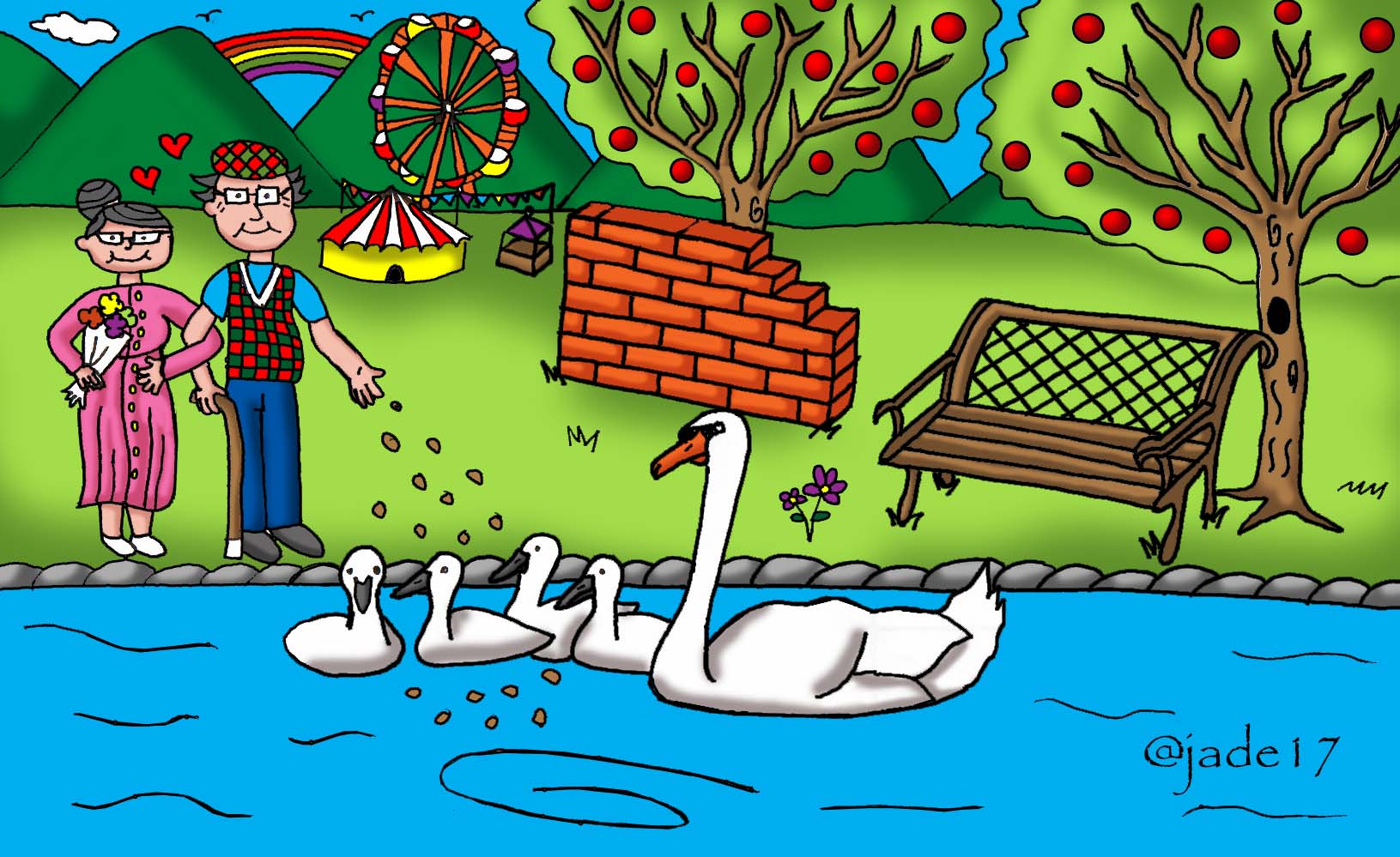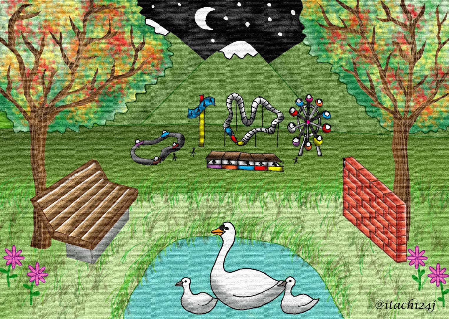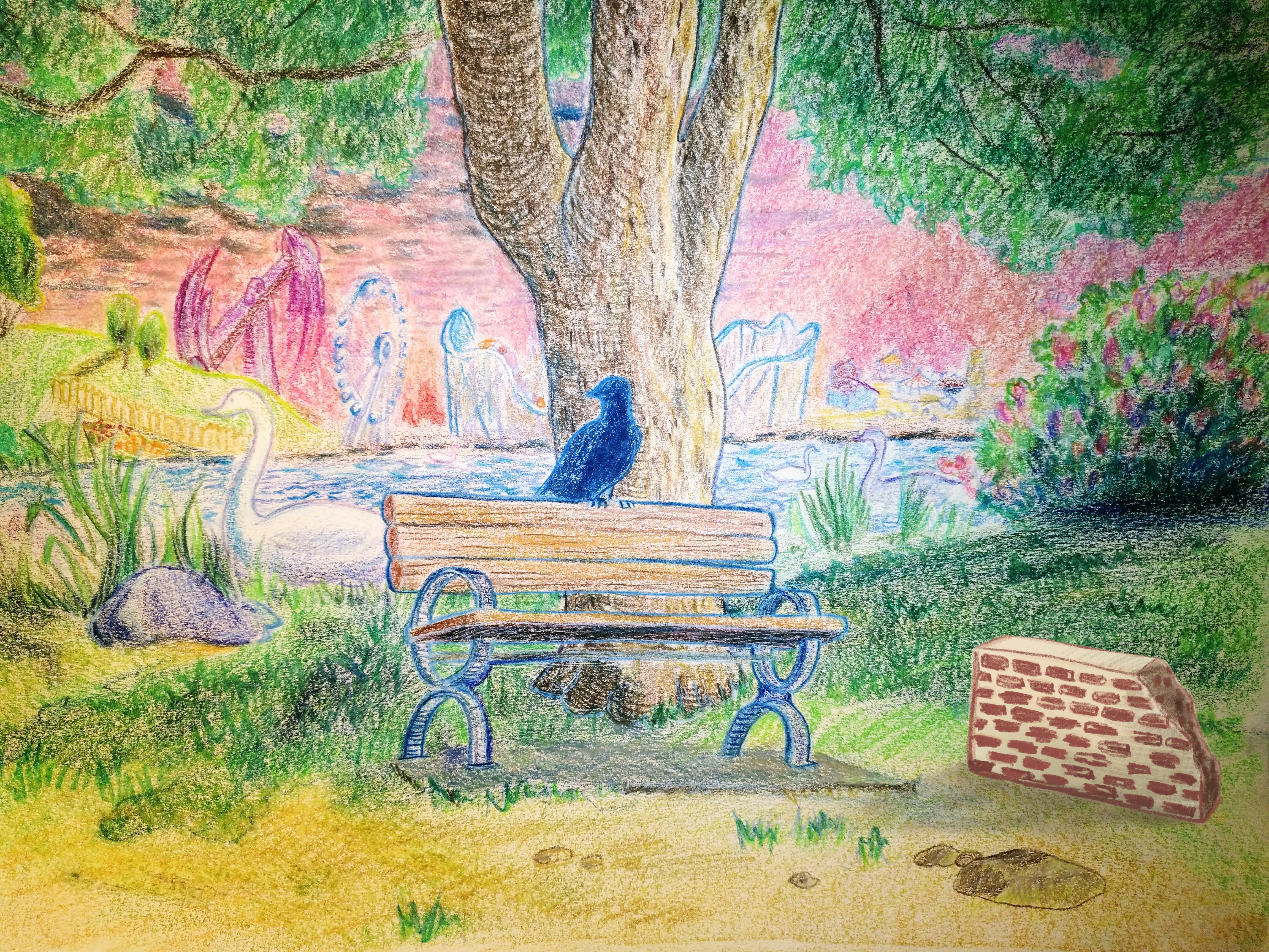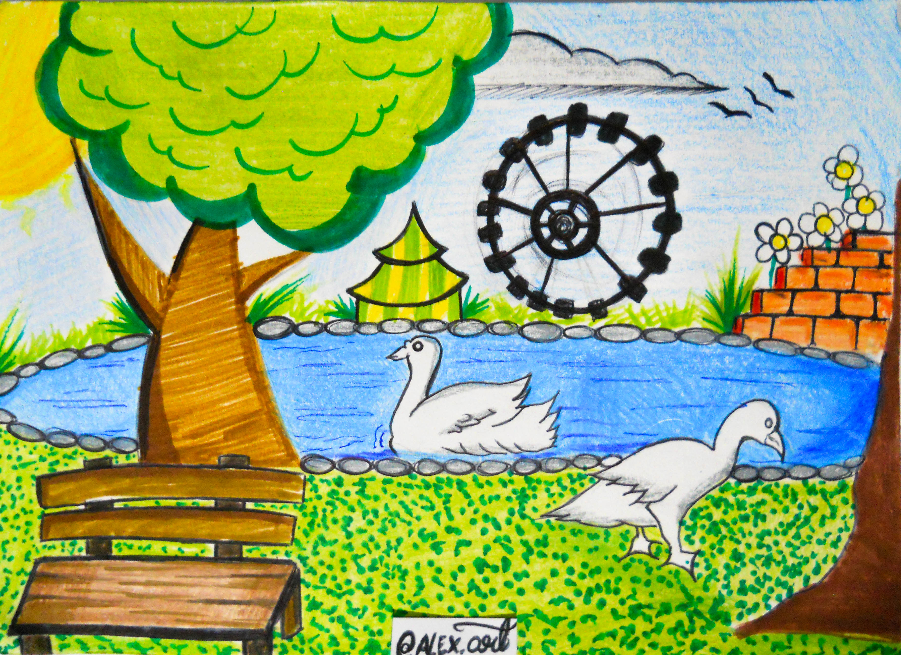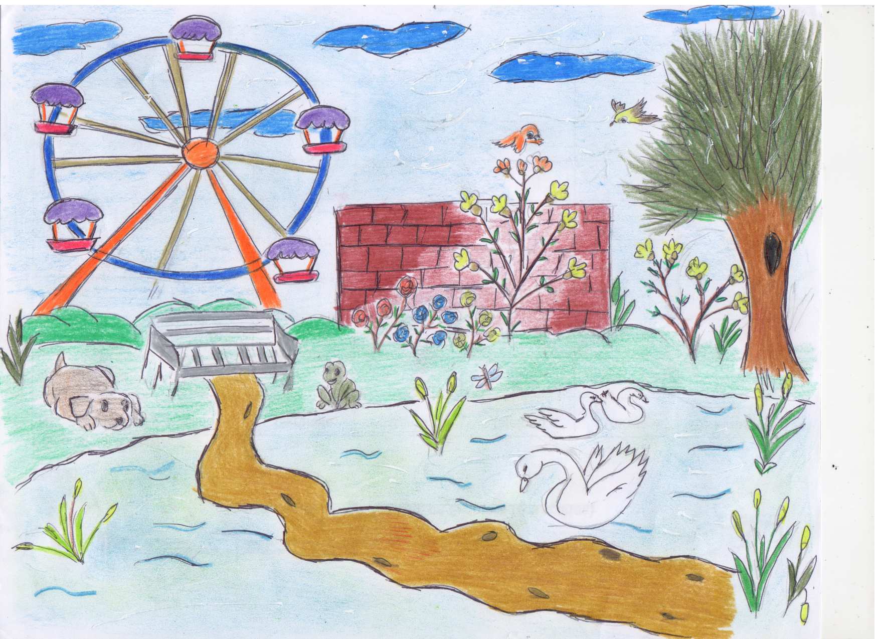 https://steemit.com/art/@itachi24j/draw-a-scene-a-bench-trees-flowers-a-small-wall-of-bricks-few-swans-and-a-giant-ferris-wheel