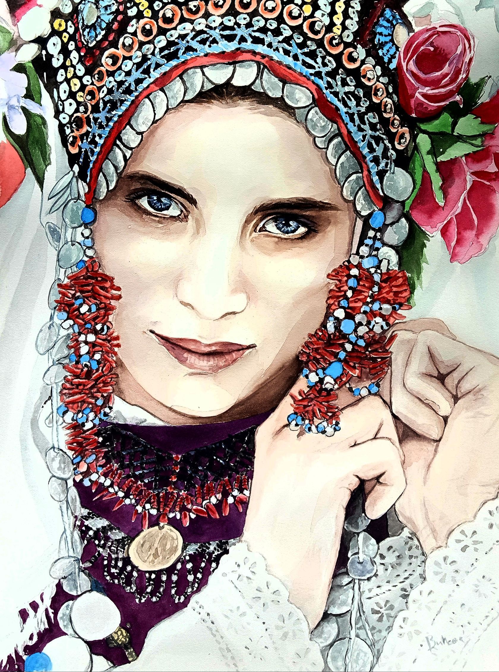Before I painted this piece I was searching for some photos of Slovak girls in their traditional costume. However, I saw a photo of a girl in Bulgarian costume and was sure I want to paint her. All the colors reminds me of diversity of life and its treasures. And in the middle a woman who gives life and wakes up all the symbols on her costume.