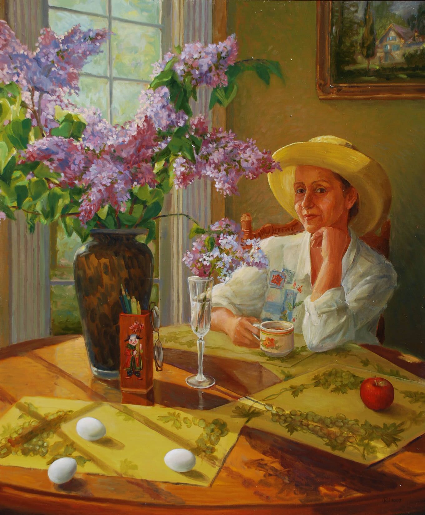Я разноплановый художник и работаю в разных стилях и техниках и рисую работы на различные темы. Наиболее близкой темой для меня являются портреты. Я очень хотела запечатлеть любовь и тепло своей мамы в данной работе. Моей целью было нарисовать материнскую любовь в портрете для этого я использовала теплые тона для предачи своих личных эмоций и преживанй. Я так же изобразила детали в картине для передачи нюансов жизни моей мамы. На картине за маминой спиной изображен пейзаж поселка где она родилась.