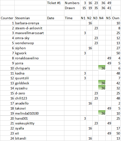 Even having one correct number did not help. This week I did not win anything again with the lottery but 4 participants had one correct number. As promised - we will have 5 winners of course :)