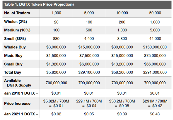 in this table we can see what Digitex expects, where a high volume of participants will make the price increase, and be able to cover expenses, without the need for high inflation, thinking about the inclusion of new users is not impossible, since that many would feel attracted with the simple fact of eliminating commissions, they would not be victims of losses as they have seen in other exchange systems.