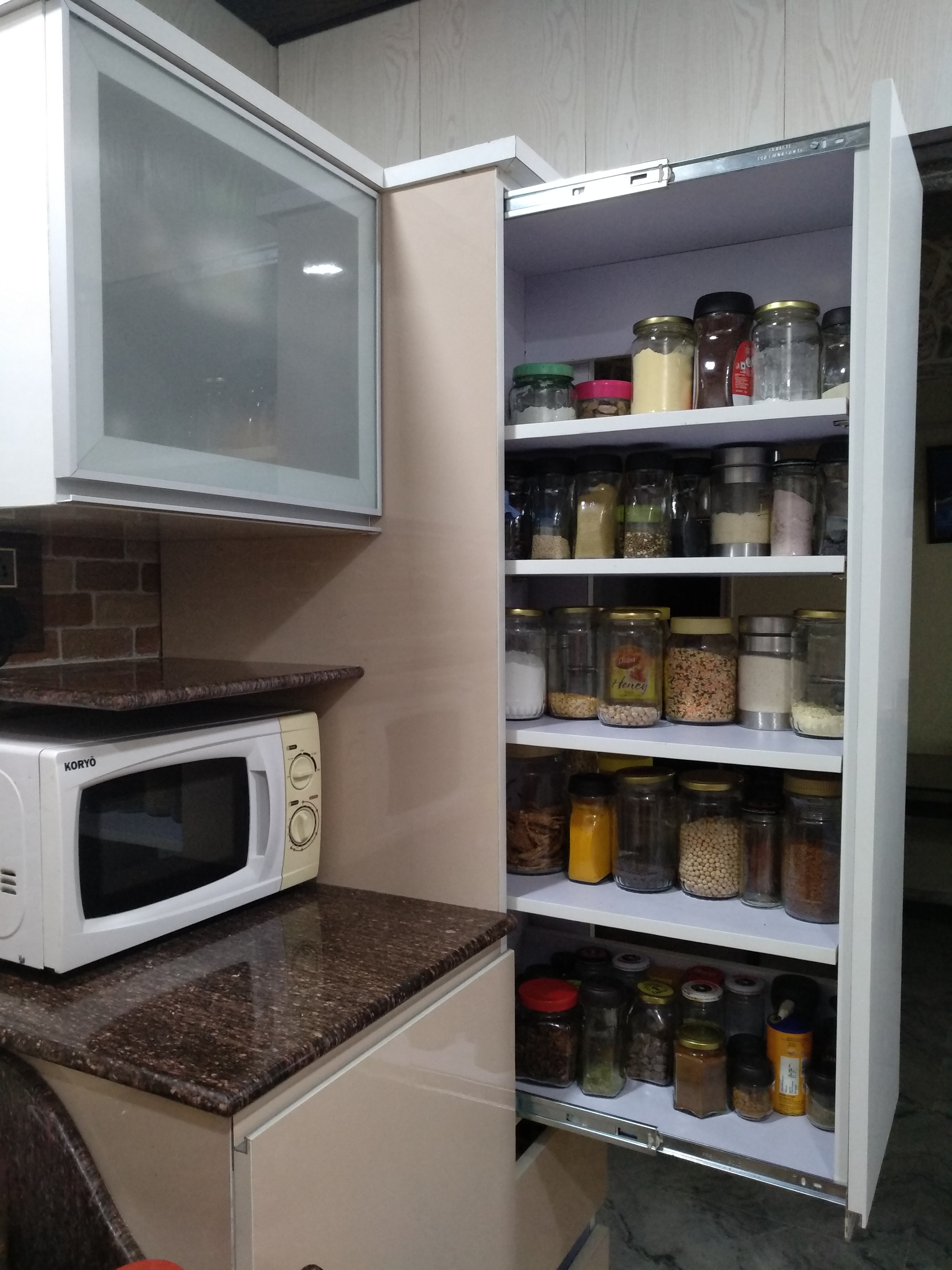 Plz check these pics... mom's kitchen pantry.. She has designed and all the containers are made of glass n Ecofriendly minimising plastic containers in the kitchen and all the contents in the containers are visible without any hassle..