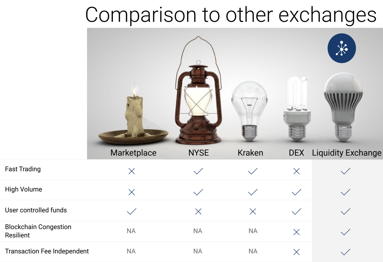 Liquidity’s Exchange is an off-chain exchange that also does not require Liquidity to hold on to funds, when atomic swaps take place, off chain.