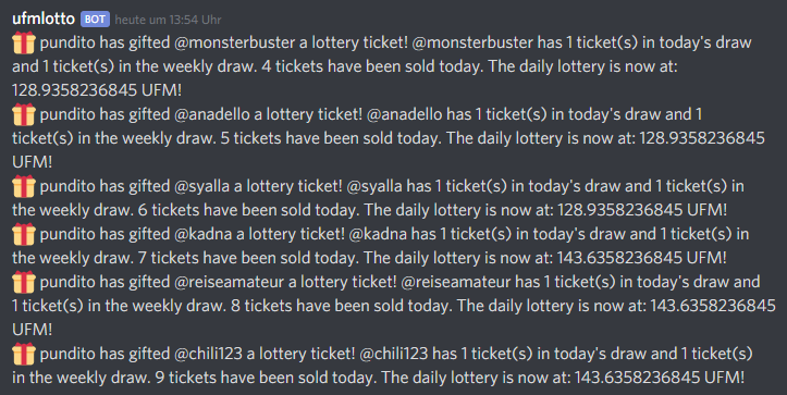 Today's lottery prize is: 153.4358236845 UFM!