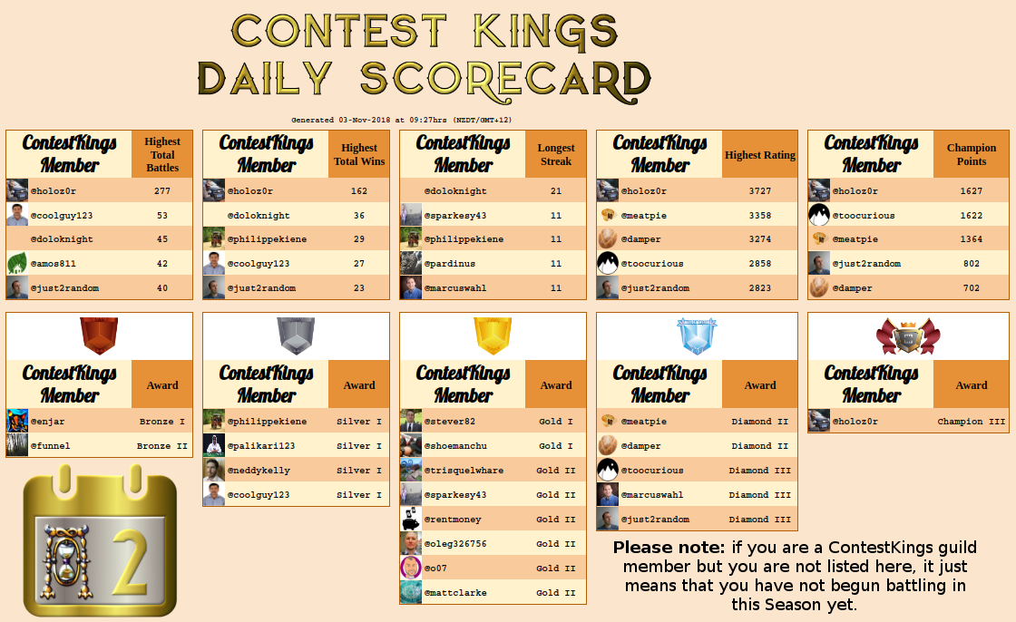 Each day Contest Kings will deliver a report listing the achievements of the members of our Guild in the SteemMonsters battles and tournaments. We are very proud of all our members, and this is one way that we can acknowledge their efforts. We also have regular prizes and giveaways within our Guild hall. As we grow, and as the development of the SteemMonsters website progresses, we will add more information to these Daily Scorecards, such as MVP's, prizegivings, and much more.