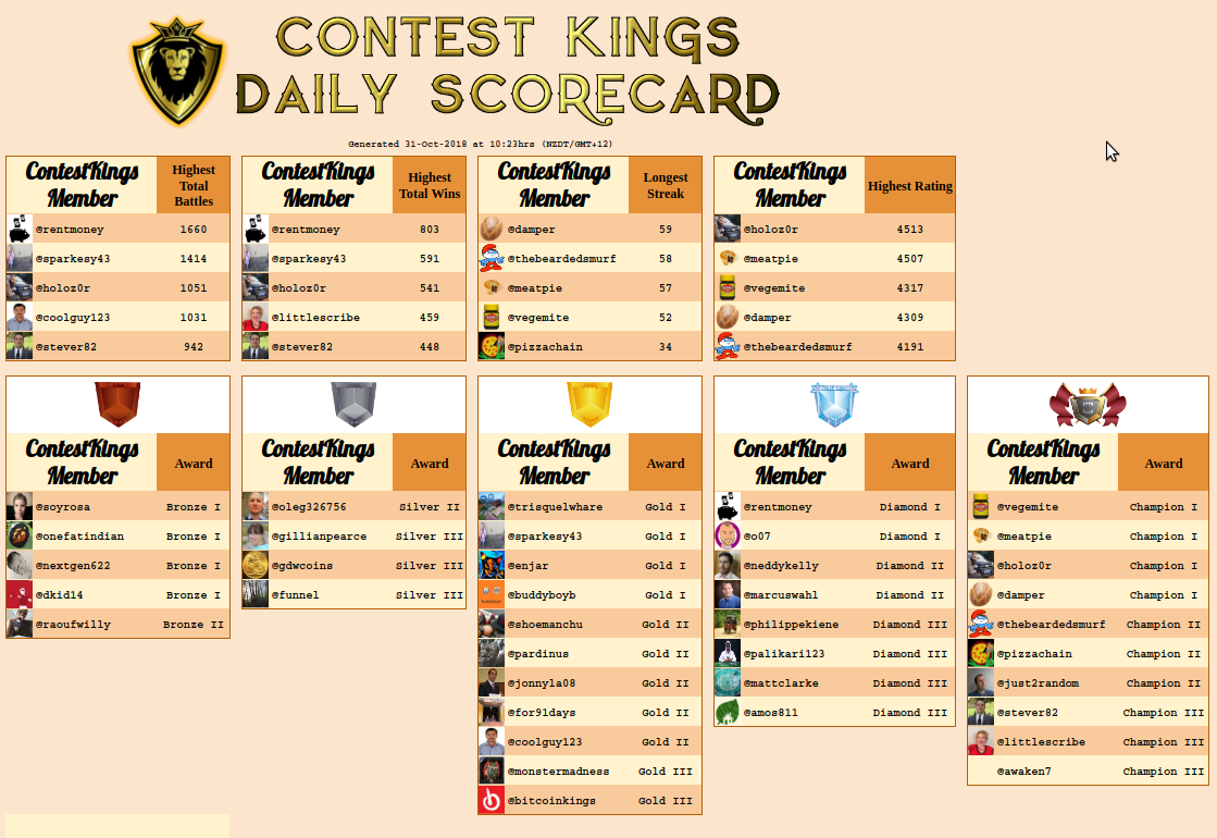 Each day Contest Kings will deliver a report listing the achievements of the members of our Guild in the SteemMonsters battles and tournaments. We are very proud of all our members, and this is one way that we can acknowledge their efforts. We also have regular prizes and giveaways within our Guild hall. As we grow, and as the development of the SteemMonsters website progresses, we will add more information to these Daily Scorecards, such as MVP's, prizegivings, and much more.