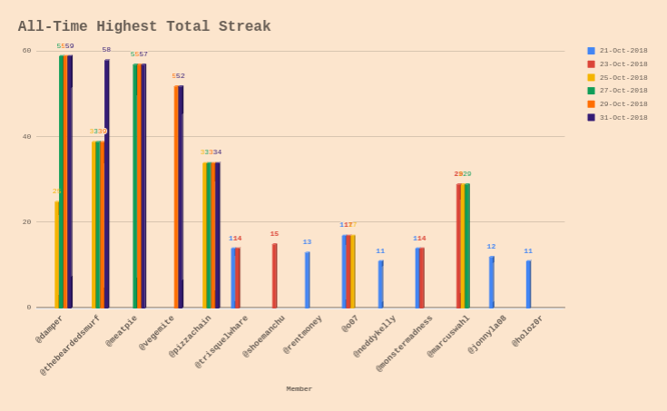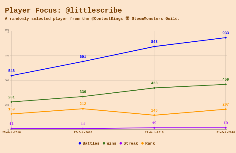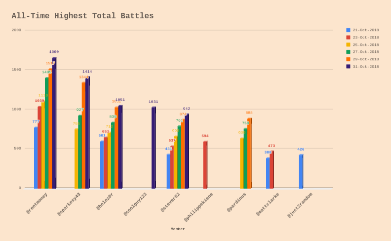 As a new feature of the Daily Scorecard, we will be focusing on one member of our Guild at random and looking at their stats. Currently the raw data in the spreadsheet which these charts are being built on doesn't contain much information yet, but as we progress there will be a wealth of historical information here to show about the player concerned. Our Player Focus for today is on @littlescribe, who was chosen at random from the member list.