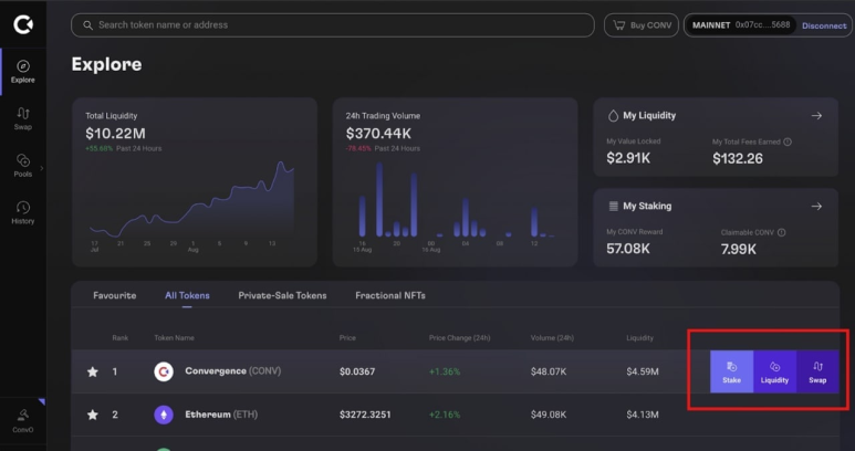 a) 대시보드에 ConvX 총 유동성, 24시간 거래량, $CONV 가격 정보 등 추가