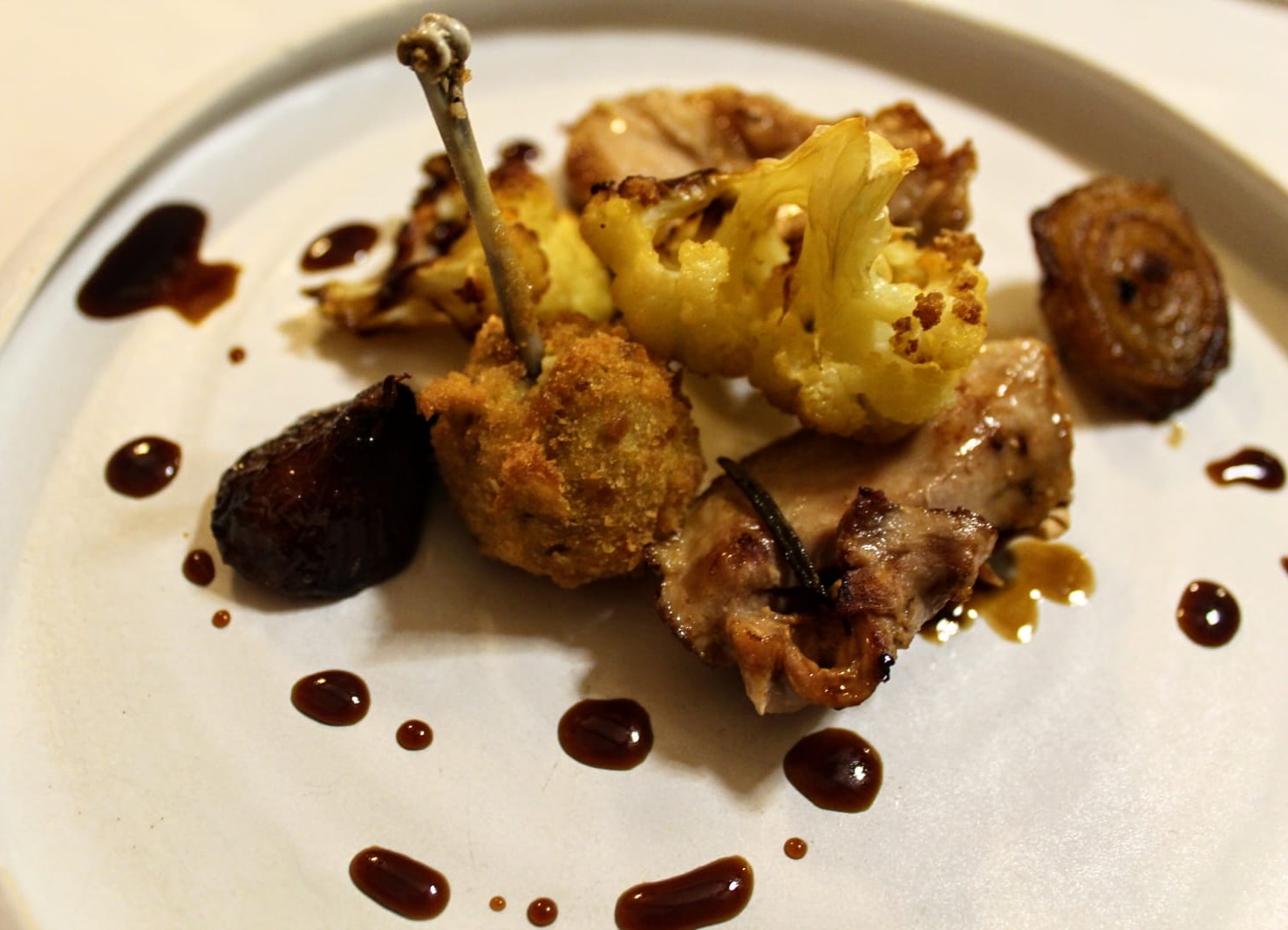 Petto di quaglia cotto sottovuoto / bon bon di quaglia / cavolfiore arrostito / cipolla caramellata / salsa teriyaki