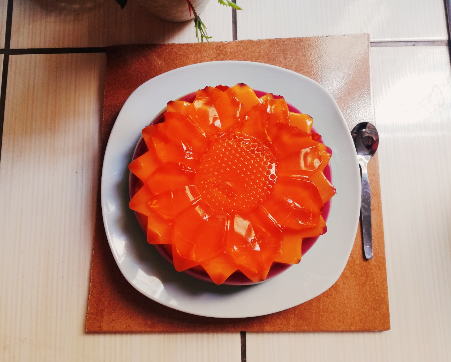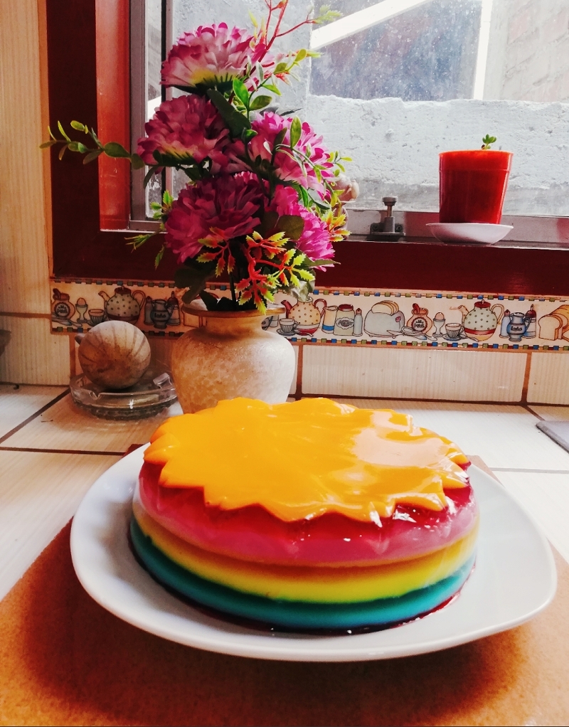 - Comenzar con el primer sabor de gelatina: separar 50 gr. y mezclar con 150 ml. de agua hervida caliente para disolver esperar que se enfrie y verter en el molde, llevar al refrigerador hasta que cuaje. Despues los otros 50 gr. de la gelatina disolver en 150 ml. de agua y hechar 2 cuacharadas o 25 ml. de leche condensada, esto le dara un color mas bajo del orginal, verter sobre el molde cuando el primero ya este cuajado. (Repetir esta secuencia con los otros 4 sabores).