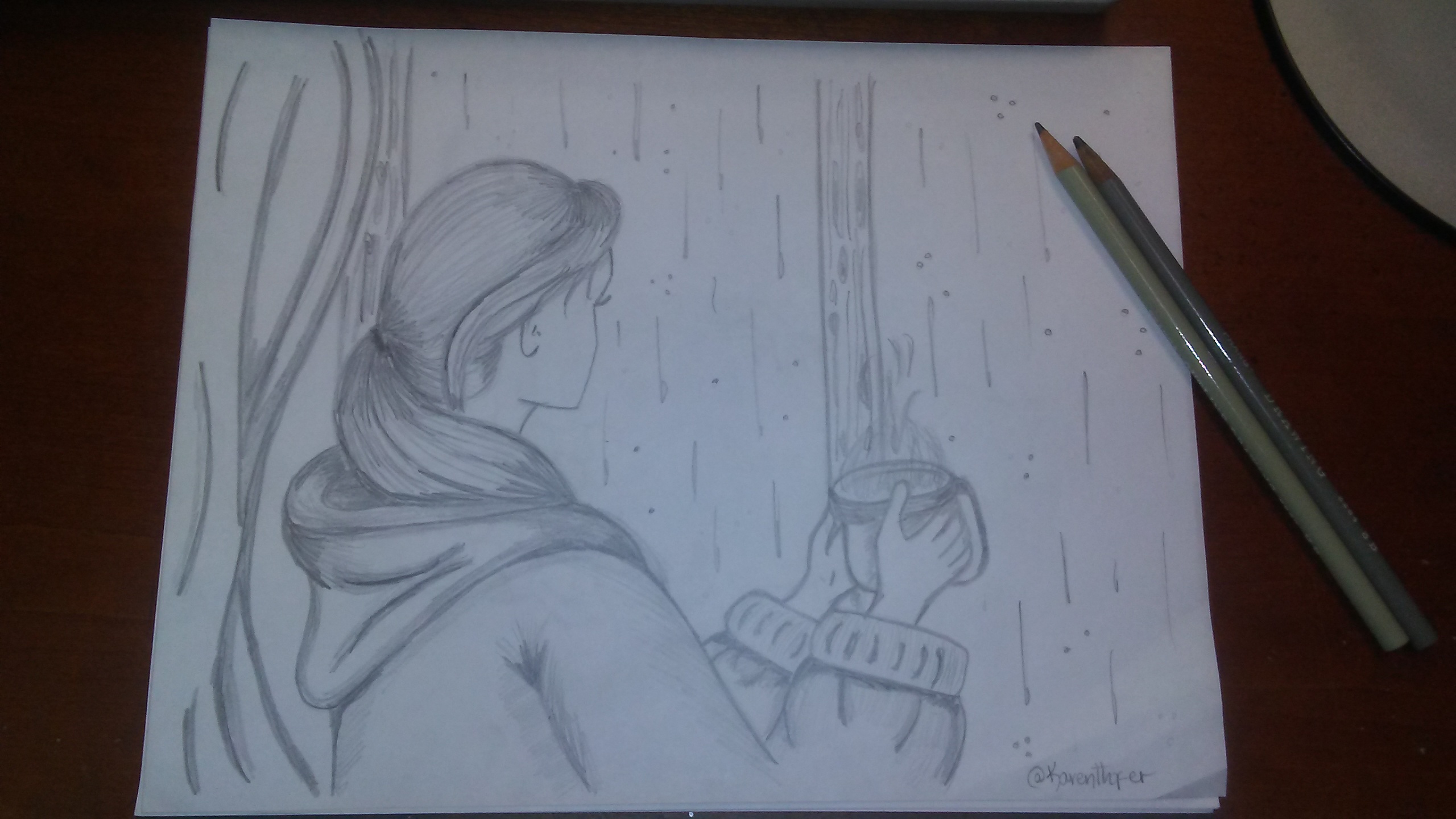 wow wow wow.... i love your drawing. i actually prefer the one you drew more than the photoshop eddited. and actually, the rainy days hold lots of memories for me. i remember running in the rain with the woman i love, i remember praying in the rain, i remember crying in the rain, it sorts of feels like every drop was someone who was crying along with me, someone who feels my pain. and i love being under my blancket when it rains, with my fan turned to the highest, with the A/C on too. lol... i know am weird. i love the feeling of cold plus this soothing wormth.
