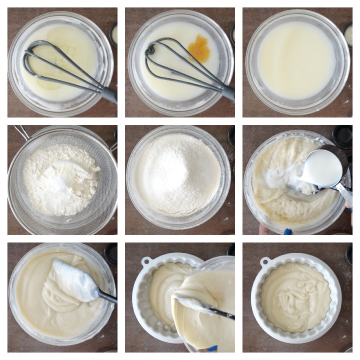 ময়দার সাথে বেকিং পাউডার মিশিয়ে চালনি দিয়ে চেলে নিন। ডিম ভেঙ্গে কুসুম আলাদা করে রাখুন এবং ডিমের সাদা অংশ বিটার দিয়ে বিট করে ফোম তৈরি করুন। ফোম তৈরি হয়ে গেলে তার মধ্যে কুসুম, তেল/মাখন ও চিনি দিয়ে আবারও ভালোভাবে বিট করুন। এবার ভ্যানিলা এসেন্স ও গুড়ো দুধ দিয়ে বিট করে ভালো করে মিশিয়ে নিন।