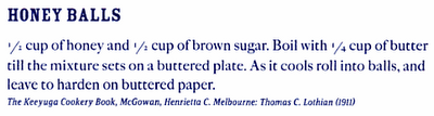 - In a small saucepan, melt together the honey, sugar, and butter. Boil for a few minutes, until it sets on a buttered plate. Let the candy cool for a few minutes and either scoop out and roll into balls or drop small amounts on the buttered plates, let cool, and roll into balls when you won't burn your hands. They will stay pliable for a while.