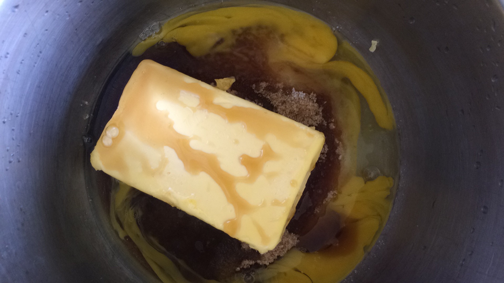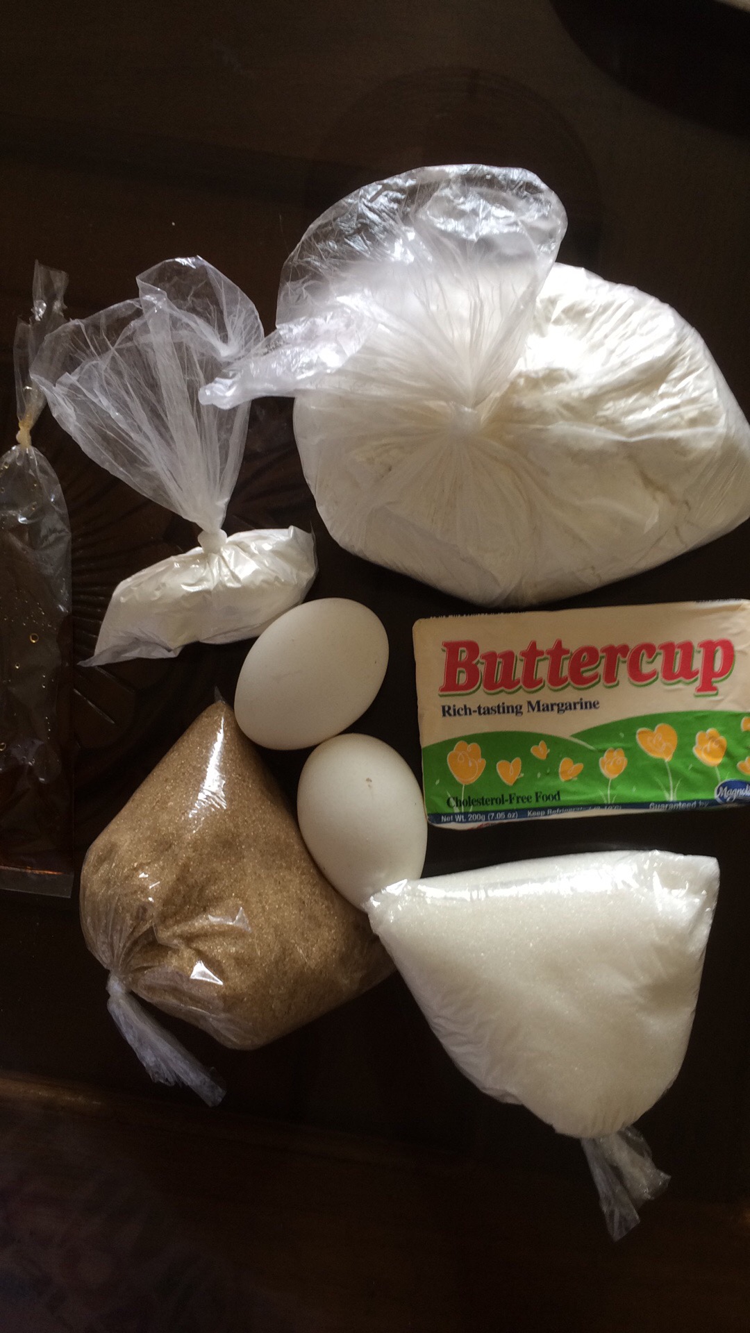 Next, we put a bar of buttercup margarine and 2 eggs in it.
