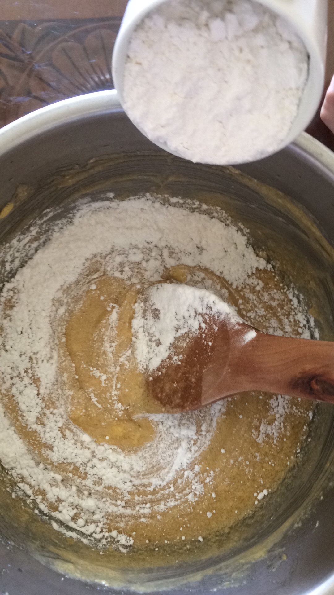 Afterwards, we put 3 cups of cake flour one at a time.
