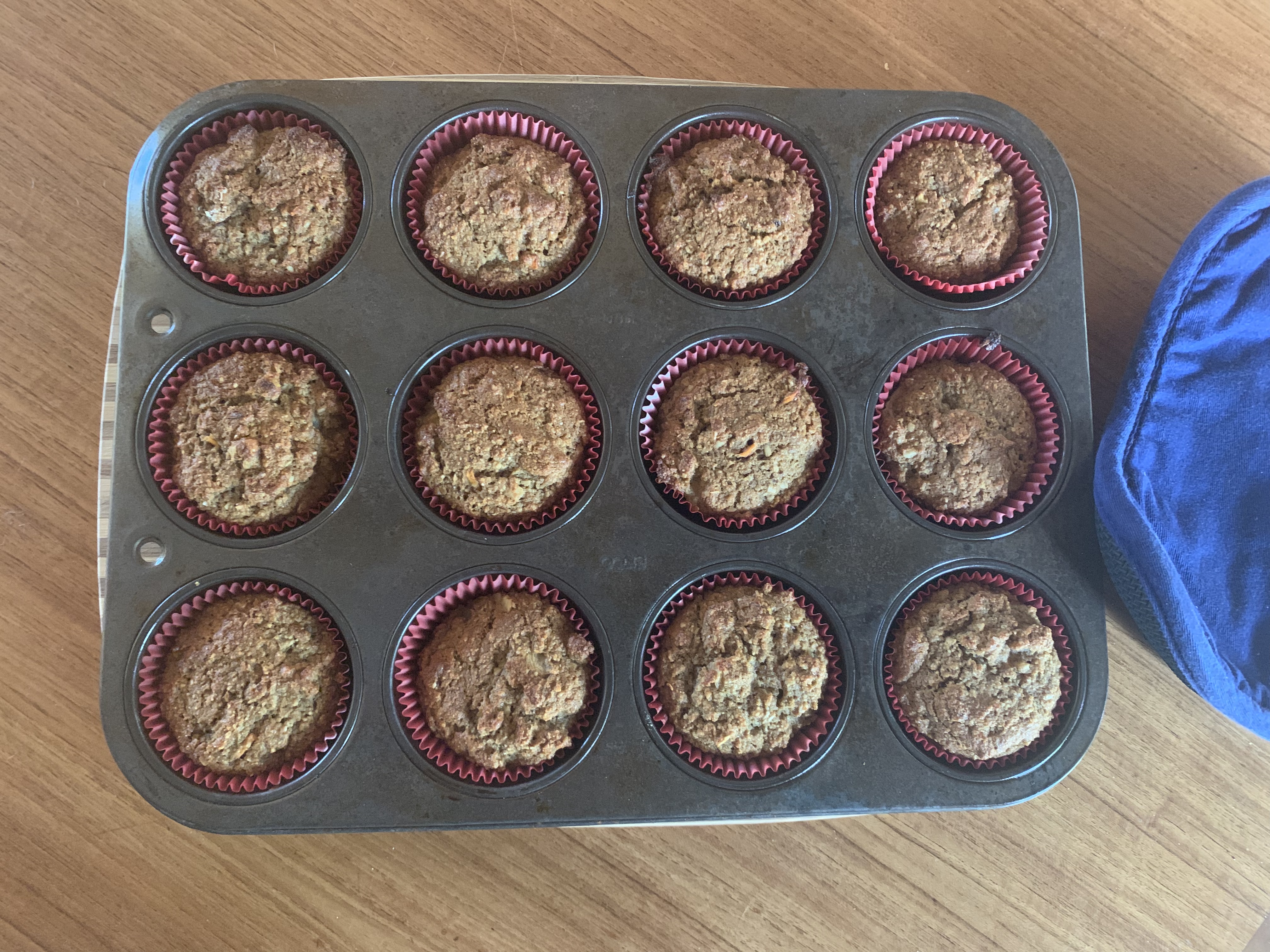 Here is an offering for you loosely based on the banana bread recipe on the back of the Kellogg’s All-Bran cereal box. Just about everything here is a substitution except the All-Bran, the bananas and the leavening. I made these this morning and believe they are the best bran muffins I have ever made. They are low gluten and get their sweetness from sources other than white sugar. If you make them, feel free to make innovations of your own.