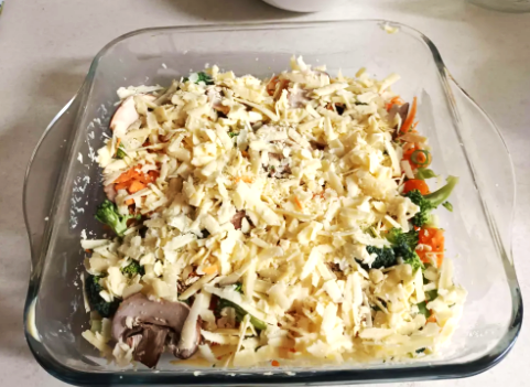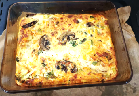 Apart from adding the extra broccoli and mushroom slices I did not deviate from the recipe and it worked well although I did find that the bits of sweet pepper could have been softer this time. Perhaps I should soften the harder vegetables for a couple of minutes in a frying pan and let them cool before I layer them on the dish.