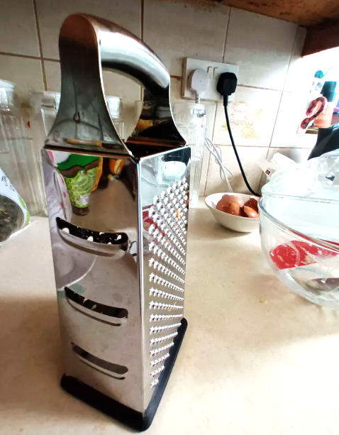 I bought this box grater online at £7.99 or around 40 Steem. It’s still very new and sharp so it was very easy to grate the sweet potato and later the cheddar cheese.