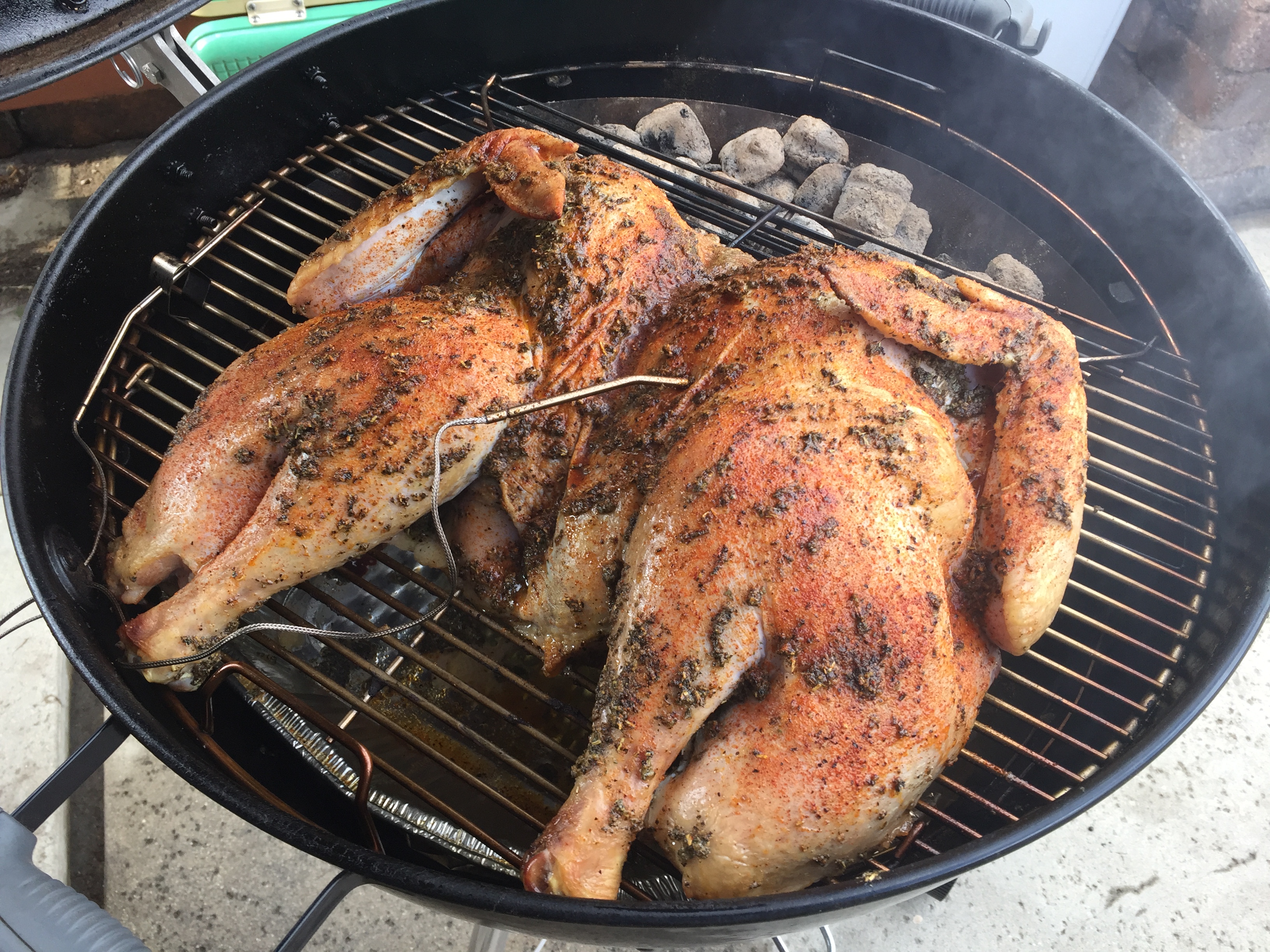 Cooked at 300° on a standard 22" Weber Kettle with a Slow 'N Sear from Adrenaline BBQ until the breasts hit 165° and the thighs hit 175° (approximately 2.5 hours). Breast side facing the heat.