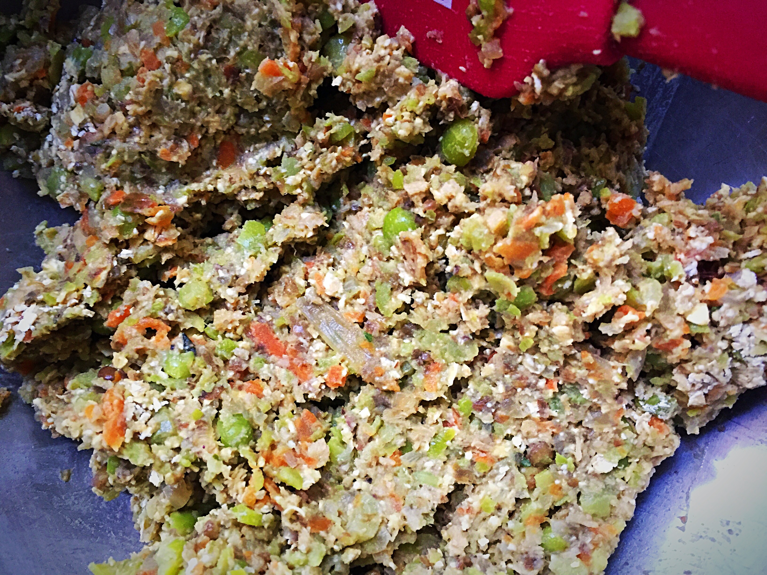 In separate pots, cook the lentils and split peas in salted water until tender. Drain the beans. Place some olive oil in a sauté pan, cook the onions until translucent. Add in the carrots, celery, mushrooms, and garlic. Cook until the vegetables are tender. Season with salt and pepper. Place all the ingredients into a food processor bowl and and process for a few seconds. The mixture should still be coarse.