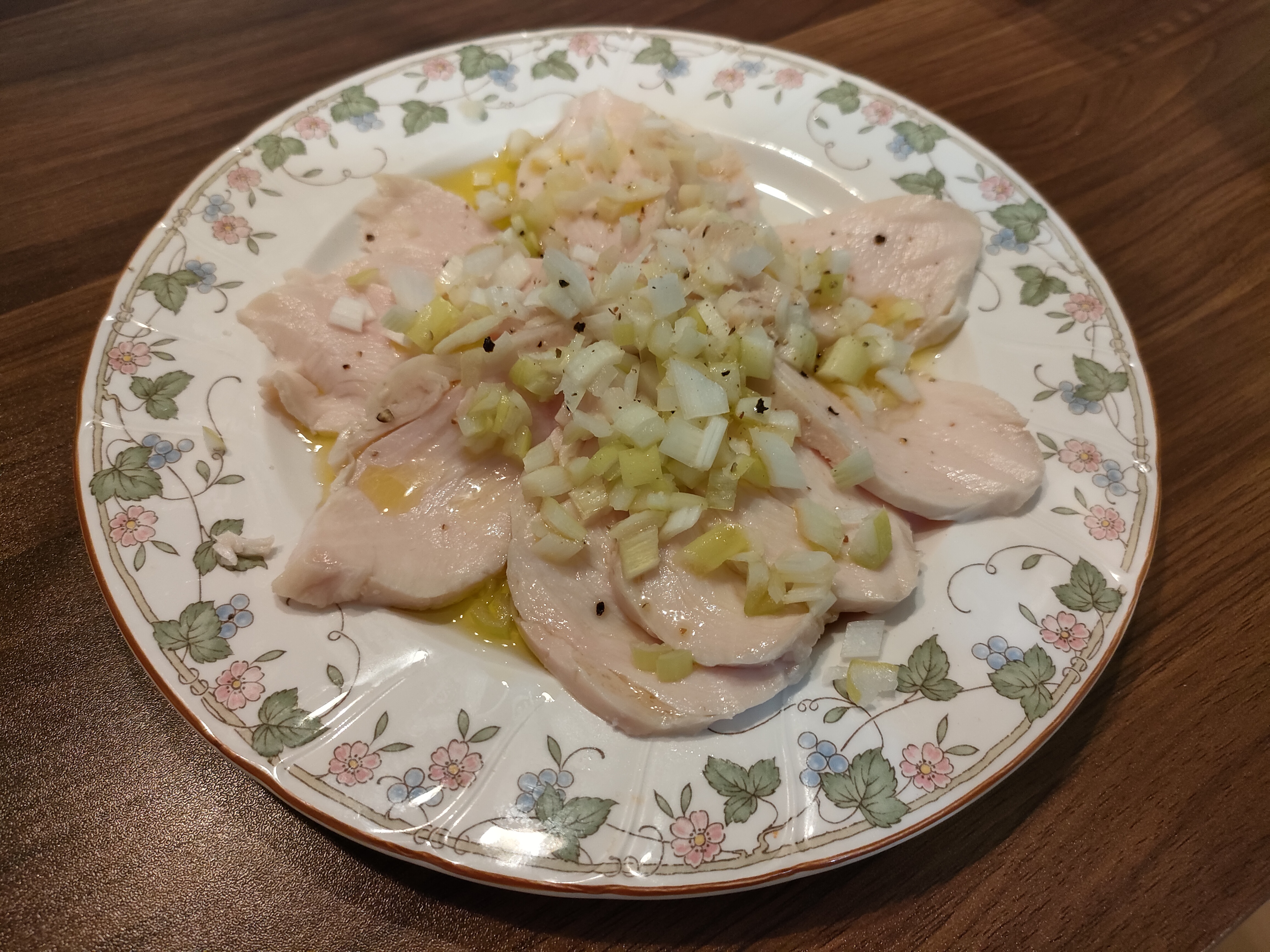 Then cut up some onions or leeks like in the picture, pour some olive oil over it, sprinkle with pepper, healthy and tasty!