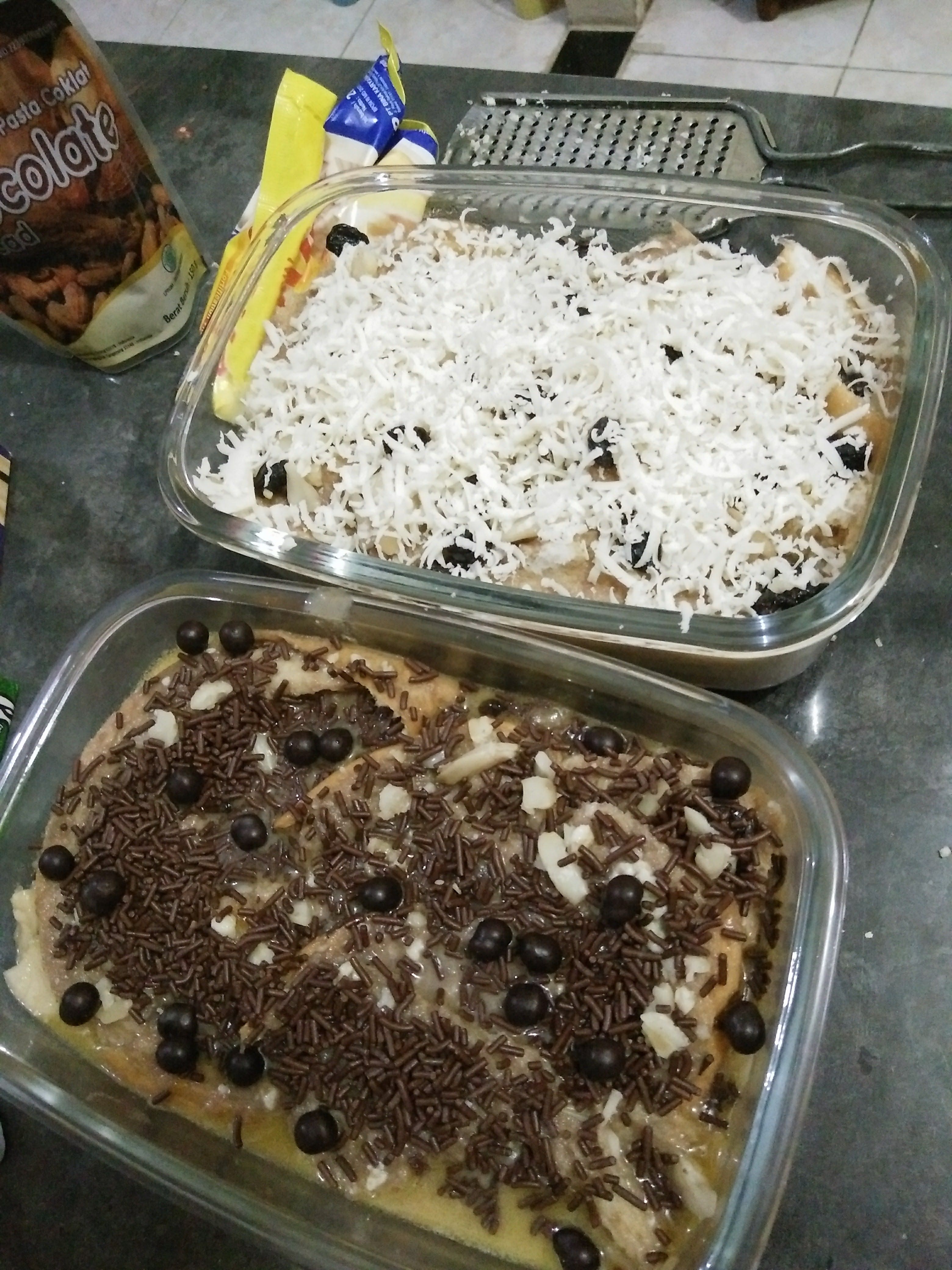 - On the first plate top with chocolate chips, raisins, walnuts and milo, then on a second dish sprinkle with cheese, raisins and walnuts
