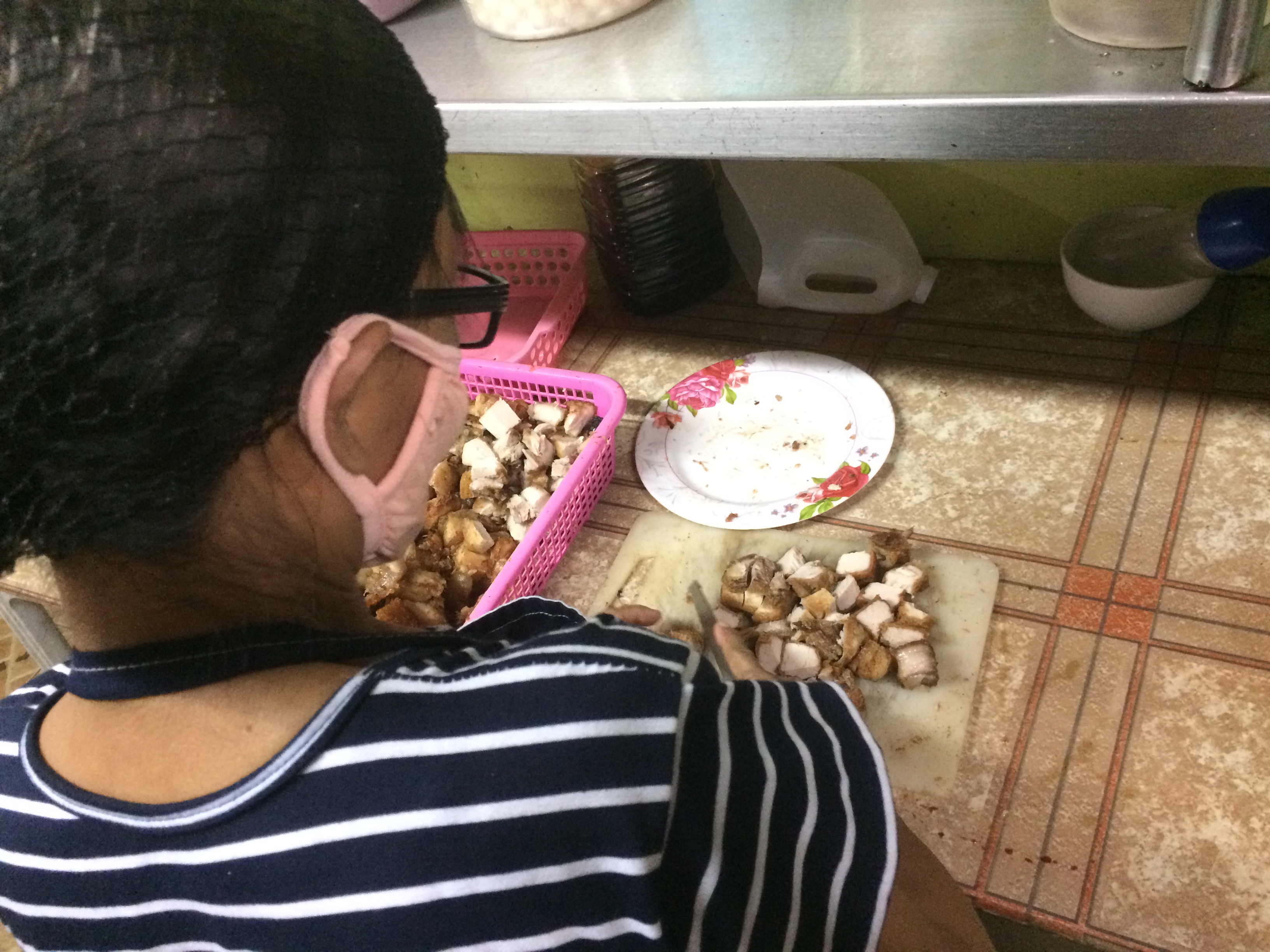 2.) turn of the gas stove remove the boiled pork in the casserole and chop