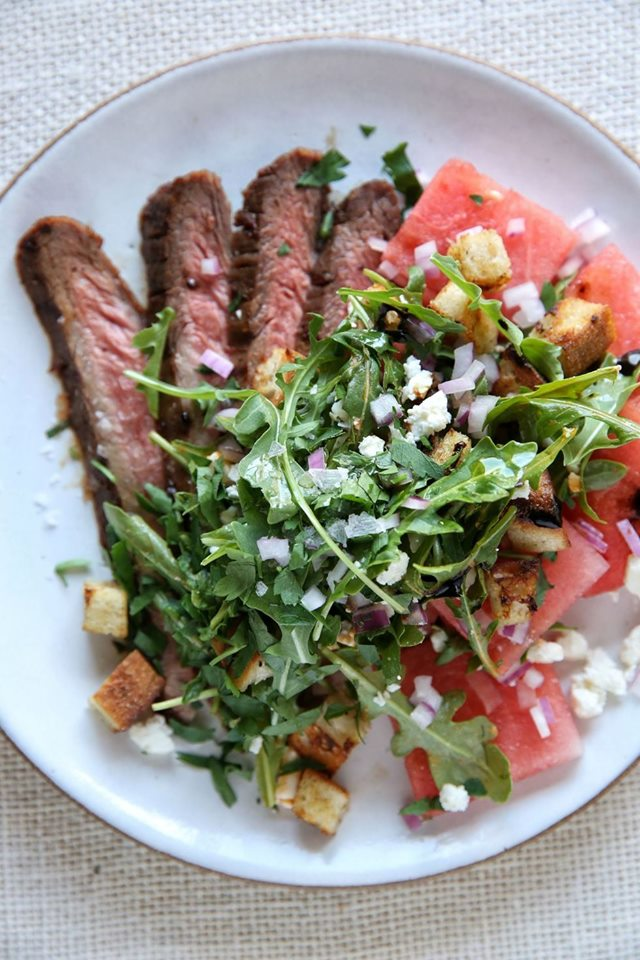Slice the meat against the grain. Serve steak with watermelon panzanella salad and top with feta and a sprinkle of sea salt.