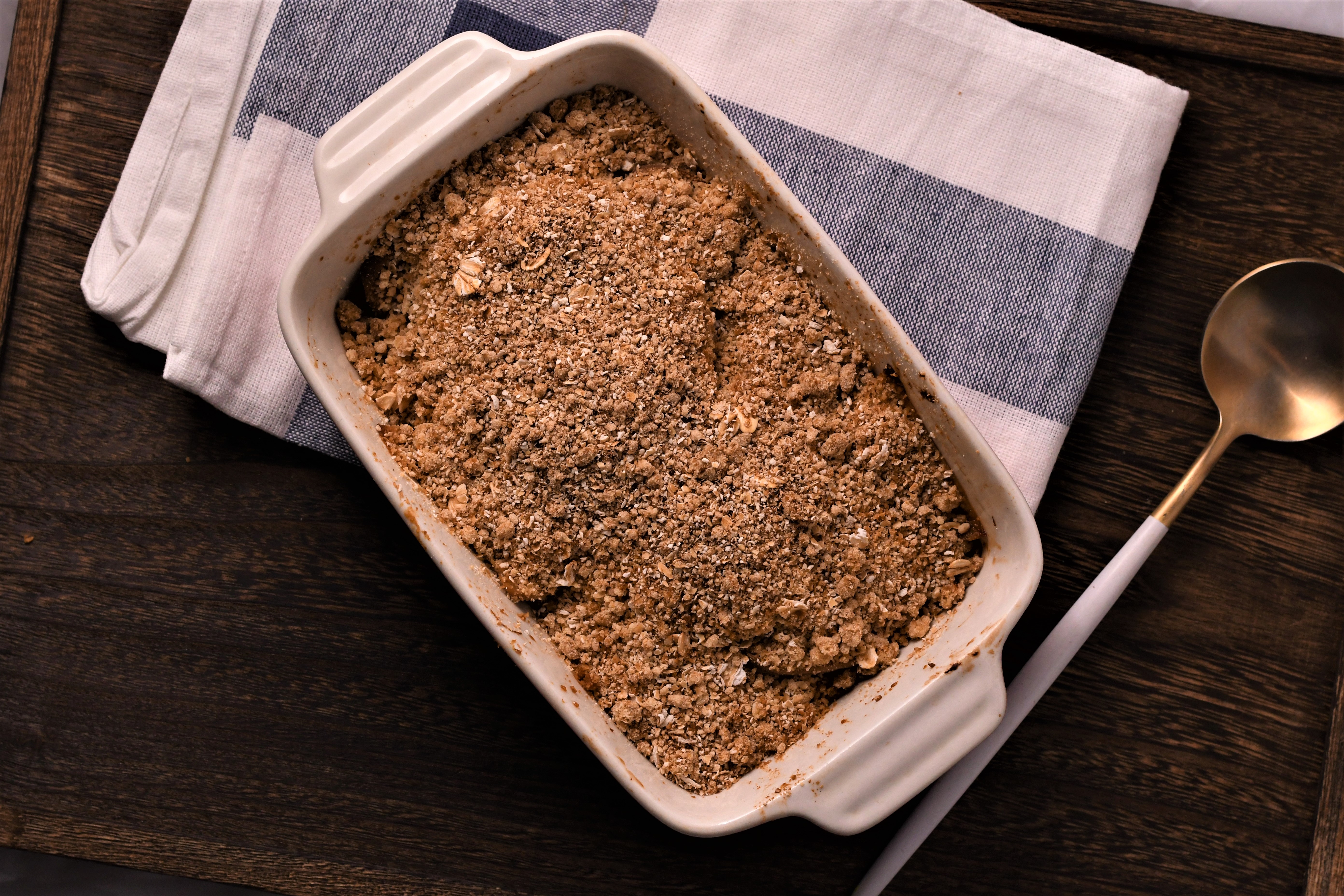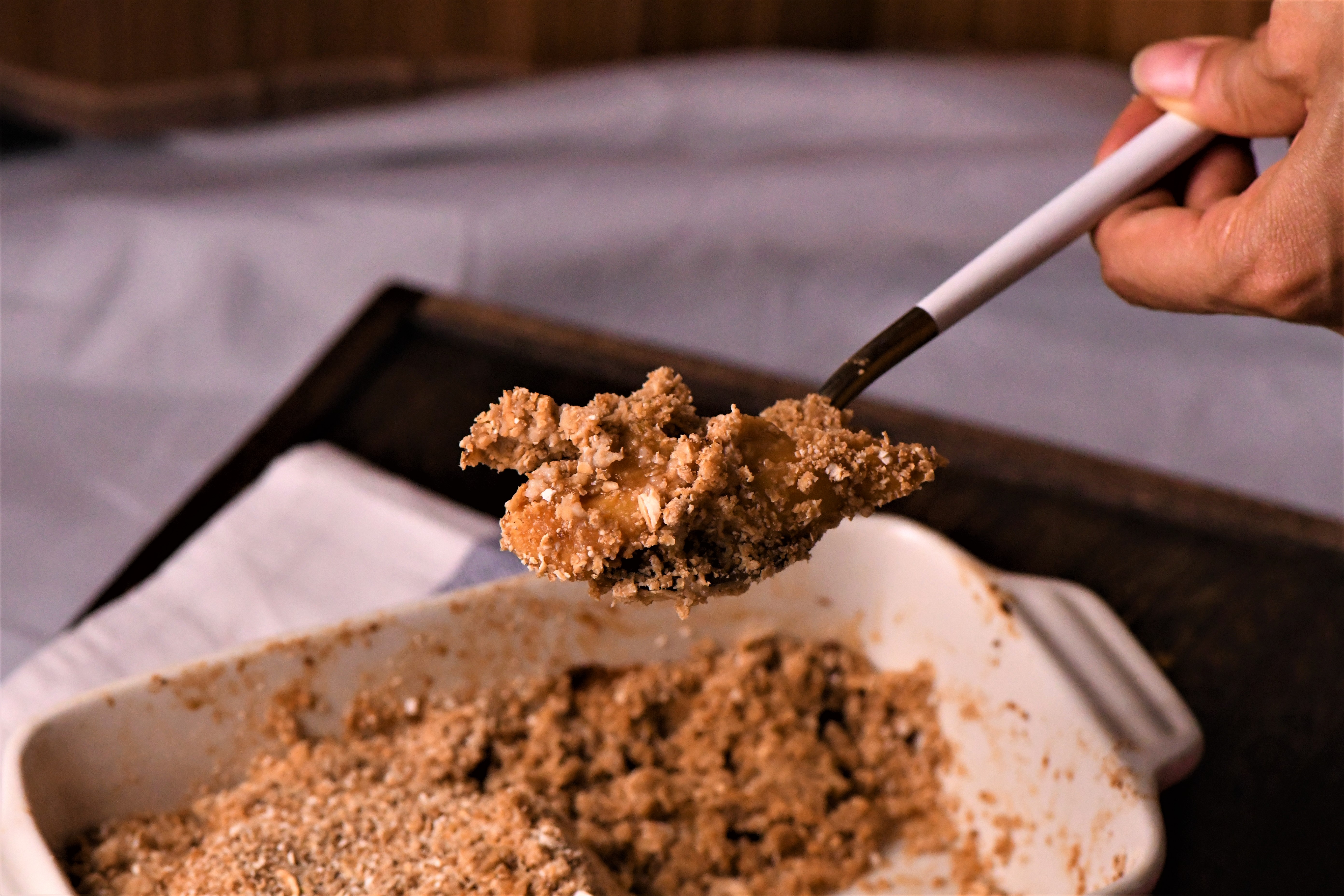 For the topping, combine oat flour, oats, ground almonds and coconut palm sugar with coconut oil into a breadcrumb-like texture then sprinkle over the caramel apples before baking for 30 minutes.