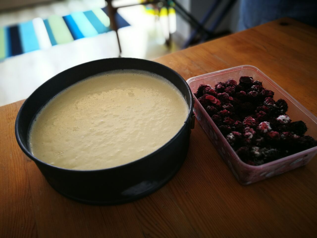 My entry for this week’s competition is called a “no bake” mulberry cheesecake. It is special because I got to pick the mulberry’s fresh from a tree on our friend’s farm in Agios Georgios. These friends have just moved to Cyprus from South Africa and they have many delicious fruit trees on the property. These very tasty mulberries went straight into the freezer to keep fresh.