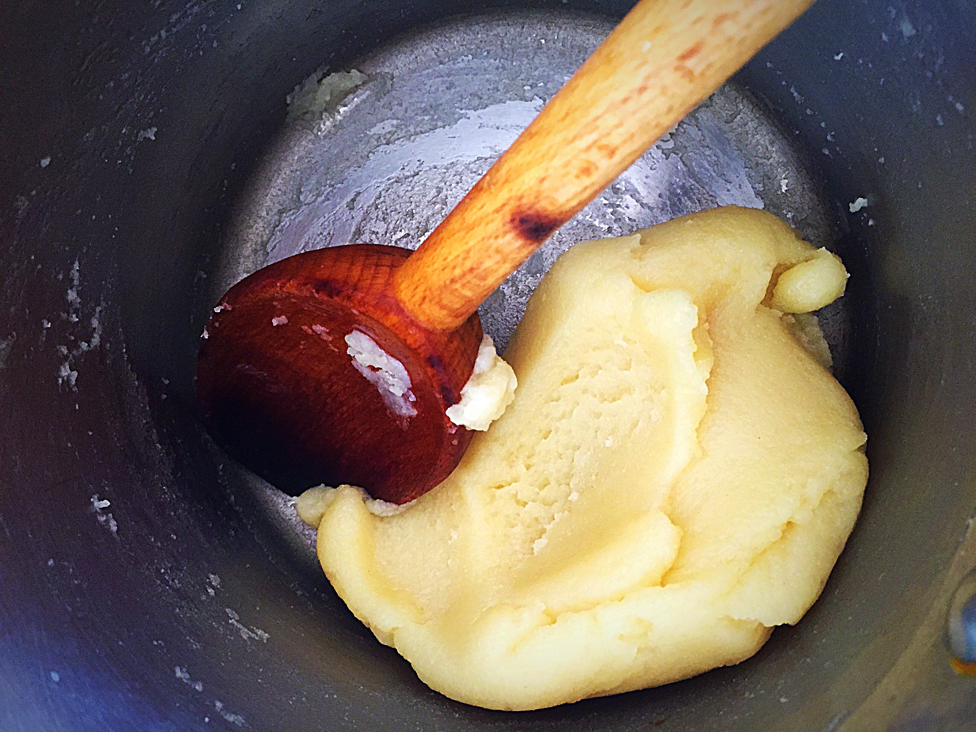 In a small pot, combine the water, milk, sugar, salt, vanilla extract and butter. Bring to a rolling boil. Remove the pot from the heat, using a wooden spoon, vigorously stir in all the flour at once. Cook over medium heat until the mixture pulls away from the side of the pot and a thin crust forms on the bottom of the pot.