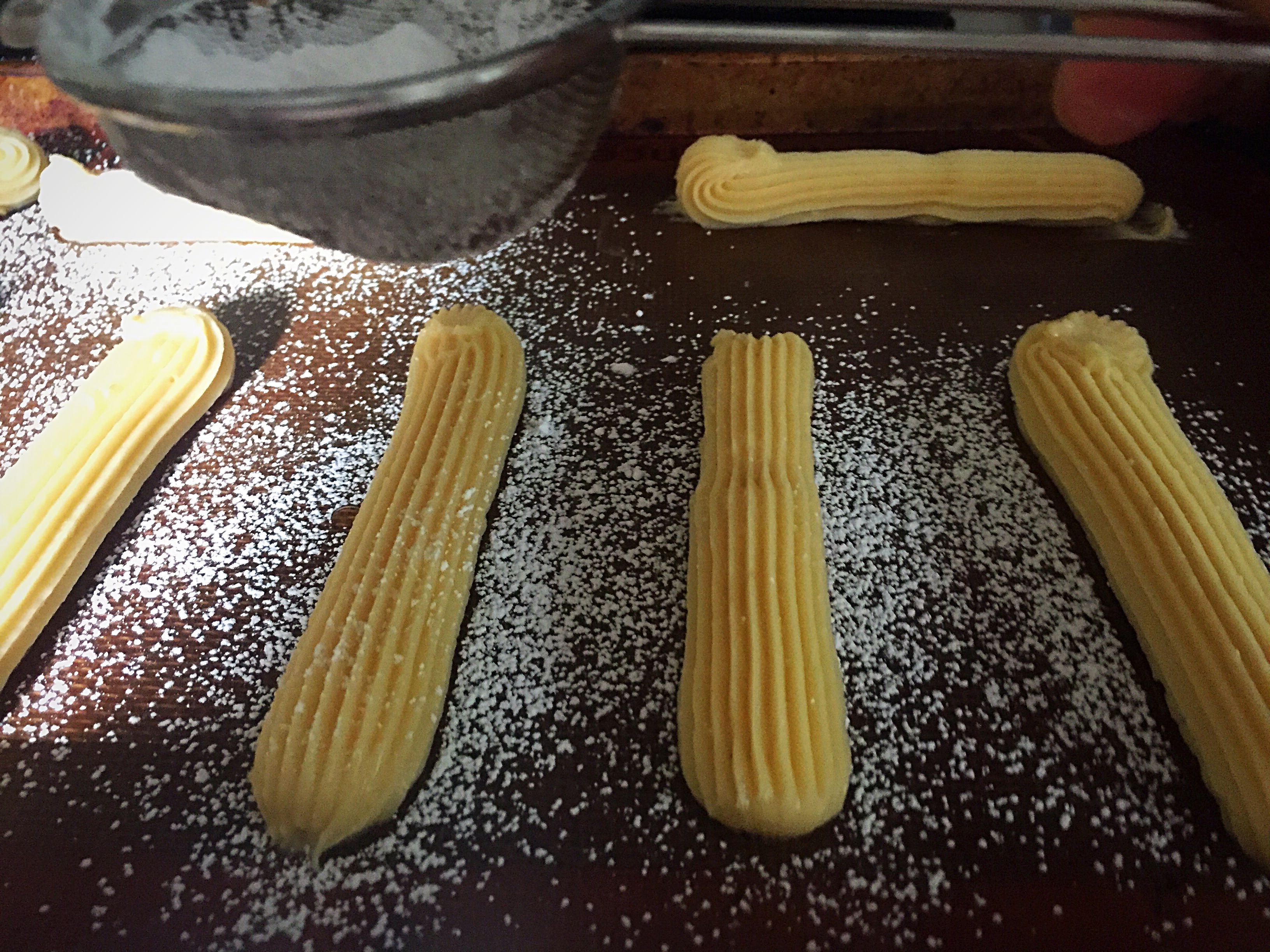 Transfer the dough to a bowl of electric mixer, using the paddle attachment, mix on low for approximately one minute to cool the dough down. Add in eggs one at a time, making sure the eggs are properly incorporated before adding the next one in. Transfer the dough into a pastry bag fitted with a large star tip. Evenly pipe the eclairs about 3 inches long. Liberally dust the tops of the eclair with powdered sugar which will make the tops golden brown while they bake.