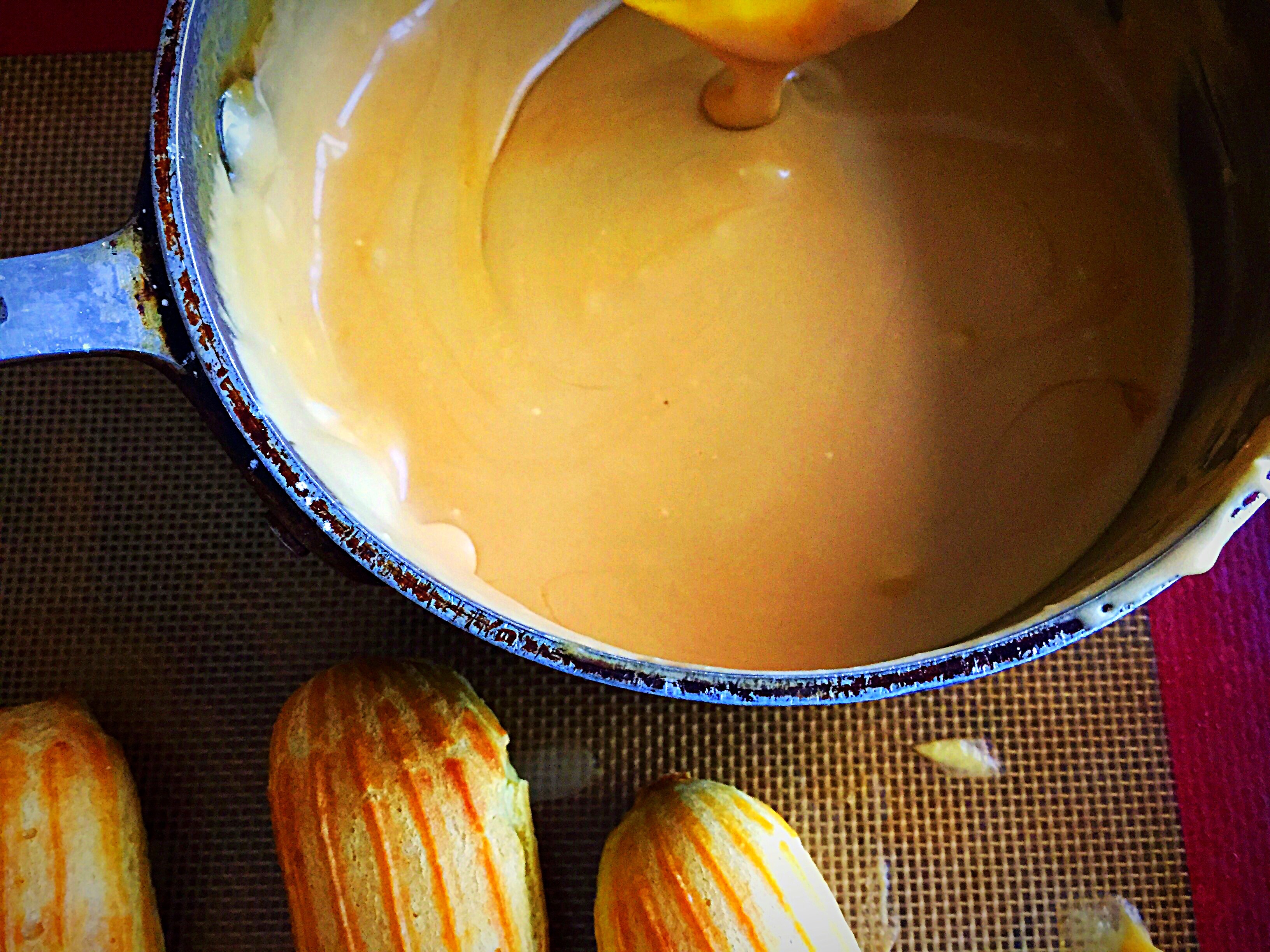 Bring the sugar, water, corn syrup, to a boil. Cook until the mixture is amber colored. Remove from the heat and let the mixture become darker and slowly add in the cream to the sugar syrup. It will splatter! Whisk until smooth and add in the salt and vanilla extract. Cool the caramel before glazing. While the glaze is cooling, place the pumpkin pastry cream into a pastry bag fitted with a small round tip. Poke two holes on the bottom of the eclairs and stuff each with pastry cream. Dip the tops of the eclairs into the salted caramel.