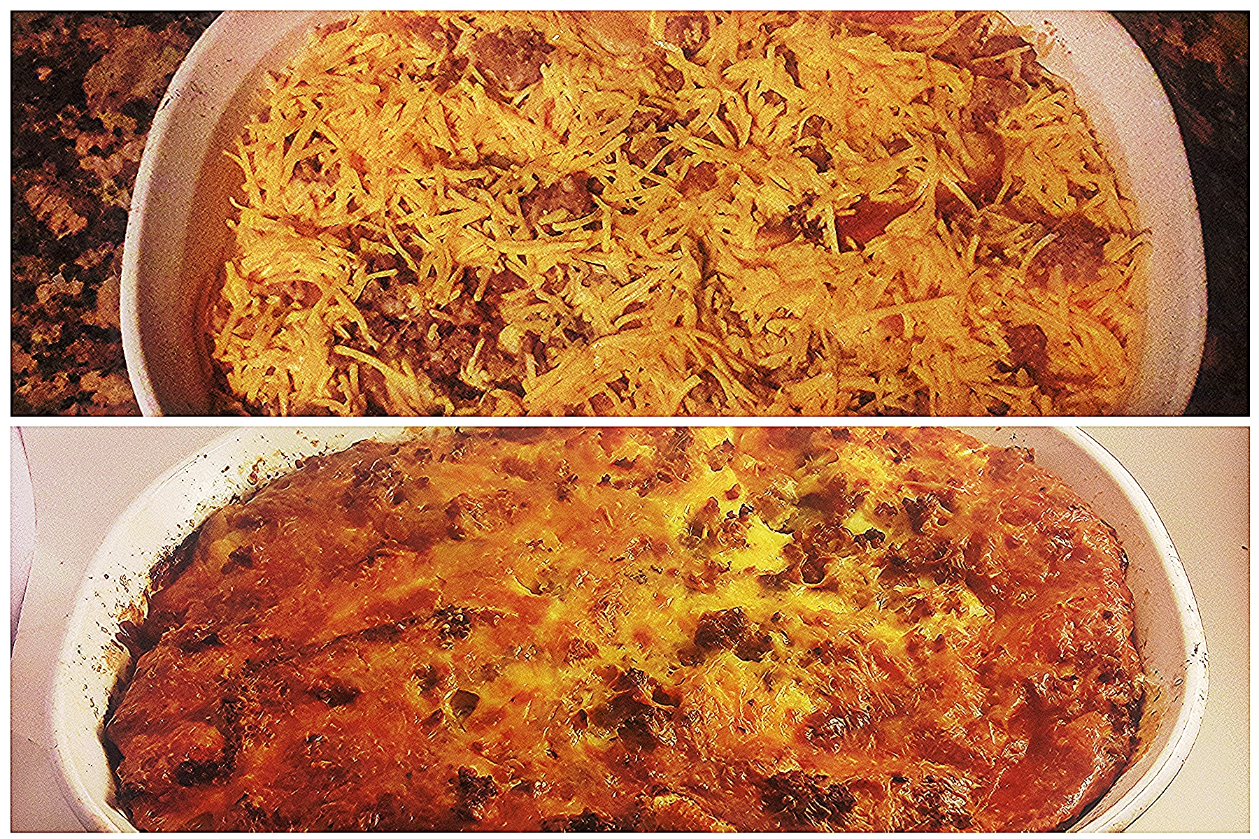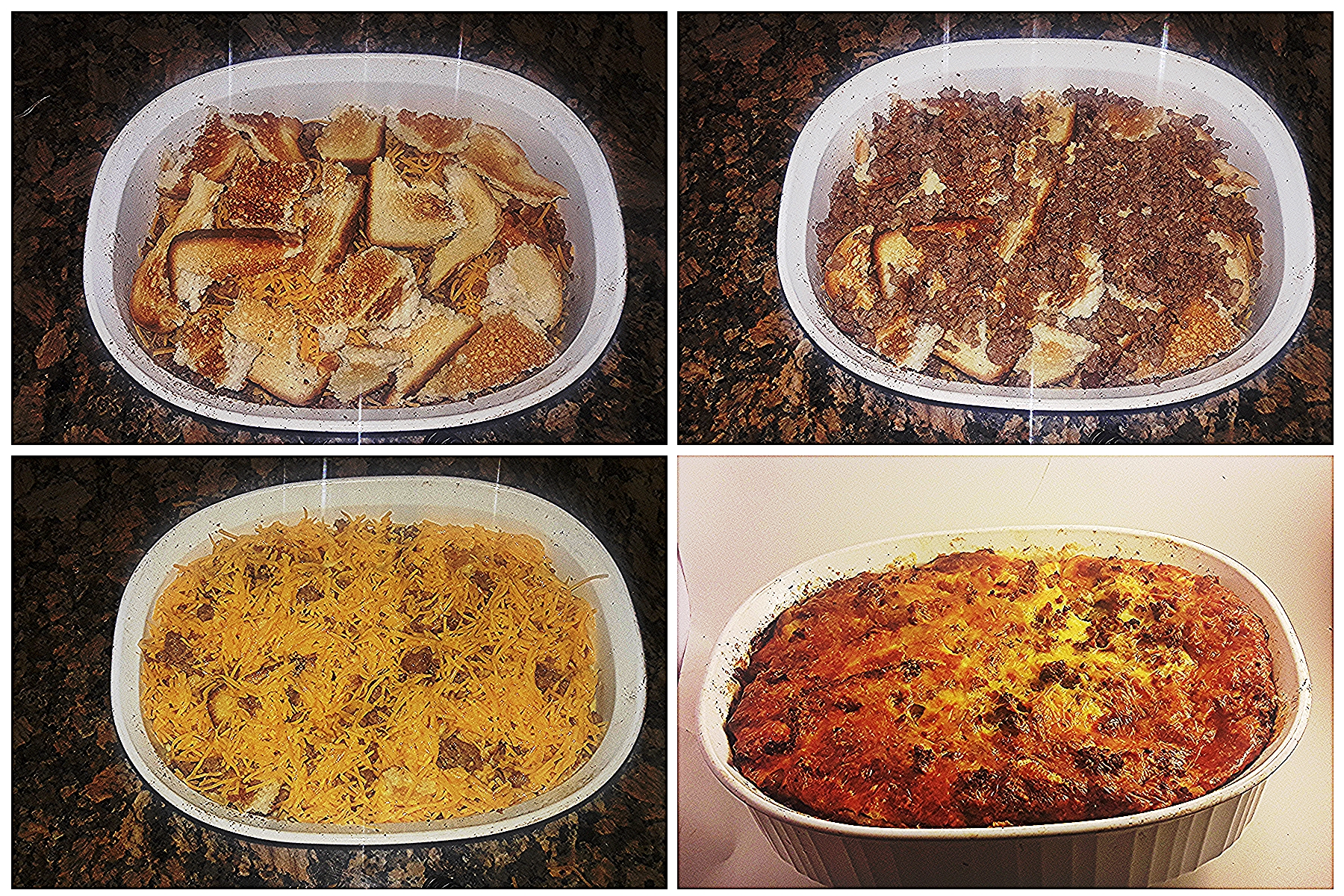 Yes, this definitely has everything in it and in a delicious way. It's flavorful and filling! Love that there's toast in the bottom. My favorite part of a pie is the crust so I look at the toast as the treasure in the bottom of the casserole, just like pie crust.