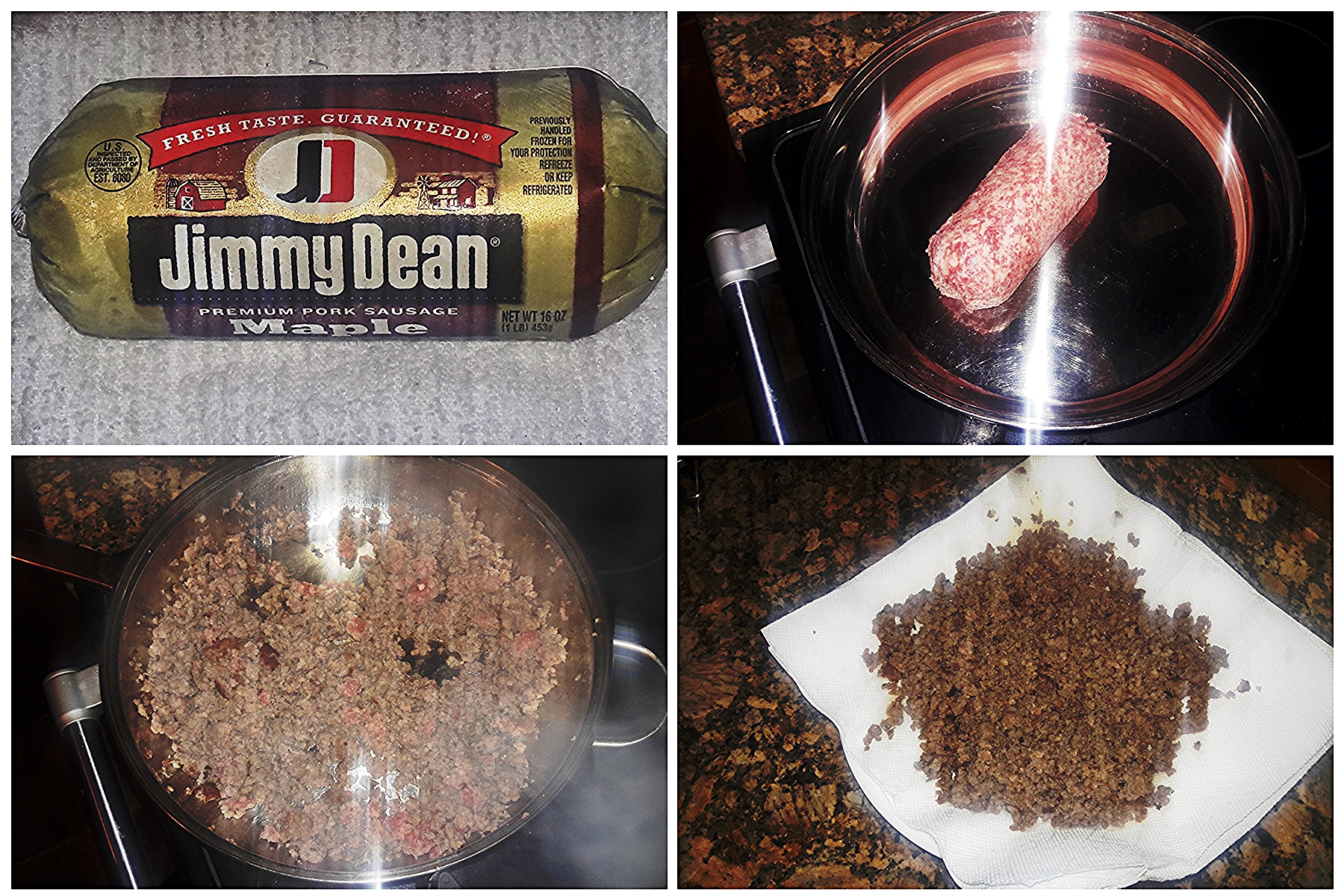 A lot of this casserole is prepared the night before you're going to have it, which makes it easy in the morning. In a large pan cook sausage over medium heat. Stir frequently until its crumbly and browned, about 10 minutes. Line a large plate with paper towels and remove sausage from heat, place cooked sausage on paper towels to drain.
