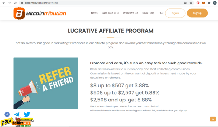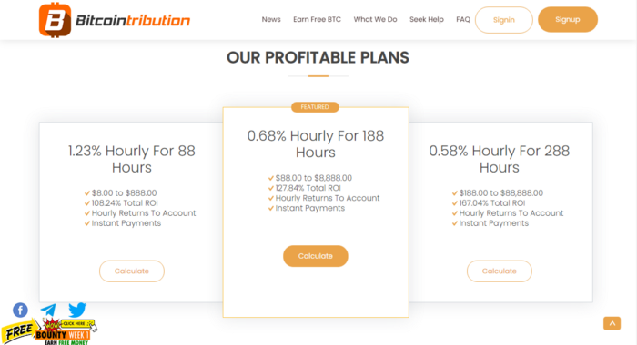 Bitcointribution is a mining site that was established more than 400 days ago with many plans and the site is 100% honest. Deposit starts at $ 8, and the site also has many features such as withdrawals without deductions and has a wonderful bounty system that starts from $ 1 to $ 10 every week and the site has a group Telegram It has 24-hour support. Plans on the site are as follows: - 1.23% Hourly For 88 Hours $ 8.00 to $ 888.00 Hourly 1.23%