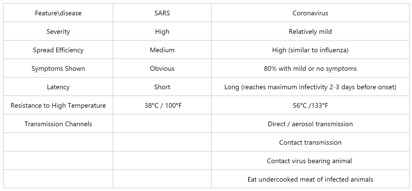 SARS is more fierce. Many people were seriously ill when first brought to the hospital. Oftentimes patients were already quarantined or dead before they started to spread the virus. Coronavirus, on the other hand, has a much higher spread efficiency; it is a pneumonia but equipped with a spread ability close to influenza; furthermore, the strongest infectivity happens at 2 or 3 days before onset of the illness. Not to mention those who have been infected yet not showing any symptoms. It is very difficult to find out who has been infected or not.