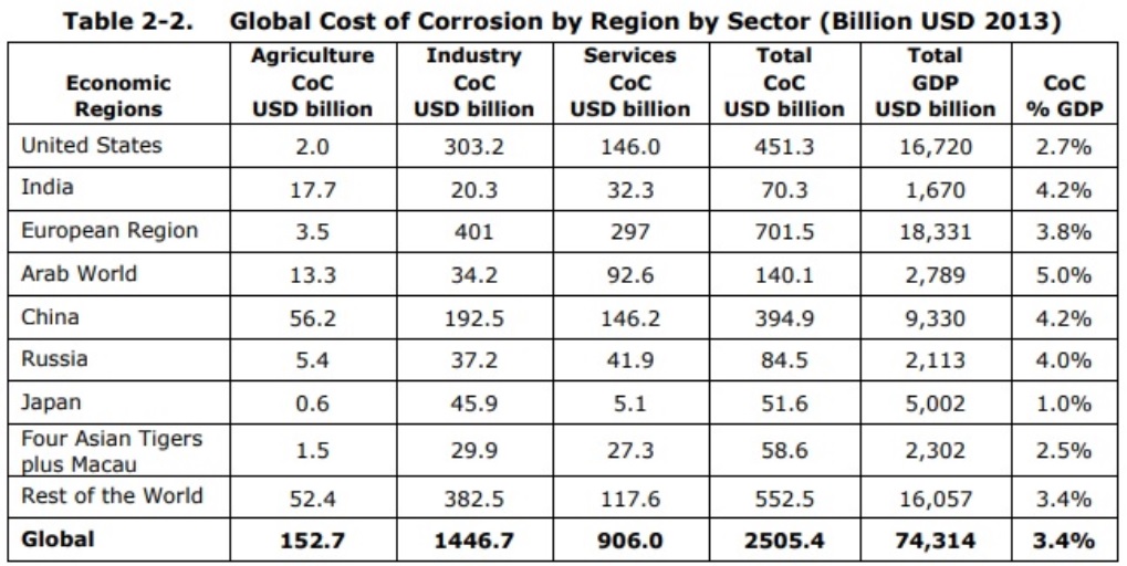La corrosión es uno de los males mas entendido a nivel mundial, si no se toma en cuenta pueden ocurrir accidentes fatales que involucren tanto perdida de activos como de vida o daños al ecosistema, dependiendo del equipo o instalaciones que sufra los daños, para el año 2013 los costos por corrosión se calcula que esta alrededor de un 3.4% del PIB mundial para ese año.