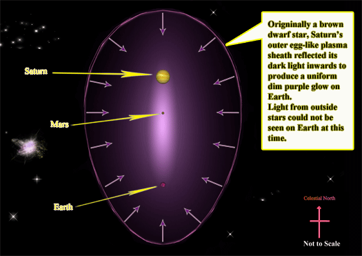 - The oldest oral traditions describe the early period of Saturn being our dwarf -star sun as a very dark sort of a "Purple Dawn" in which the middle part of the light spectrum was simply not present. Troy McLachlan's diagram shows what that looked like: