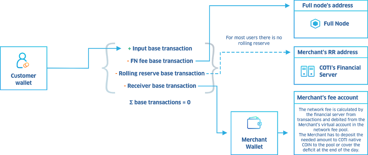 For standard payment tokens, the network fee is calculated from the transaction flow and debited from the merchant’s virtual account in the network fee pool. The merchant is required to deposit the estimated amount of COTI native coins into the pool, or alternatively to cover the deficit at the end of the day.