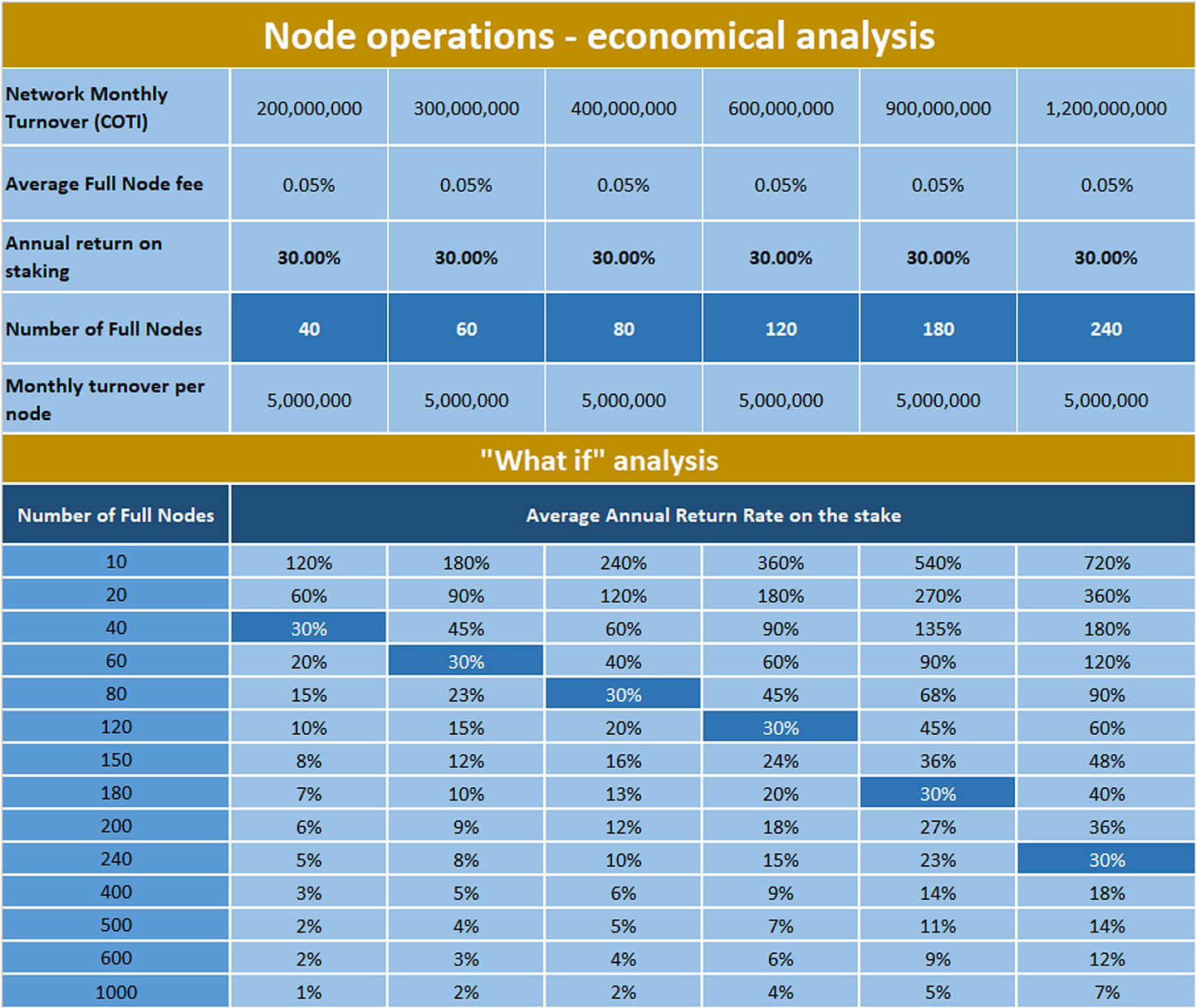 The following tables illustrate various scenarios for network transaction volume, number of nodes, fees and staking requirements.