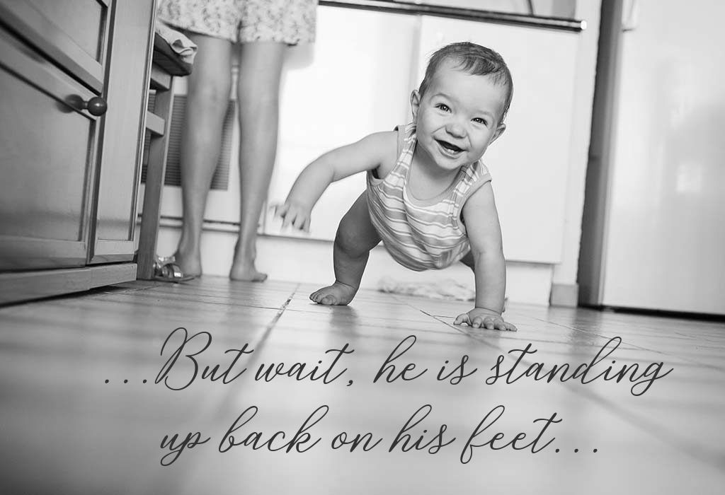 There is a cuddly little toddler in front of us, for the first time attempting to walk. He is walking slowly coming to our direction. Oops, He's out of balance and stumbles on the floor...