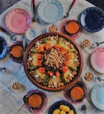 5- Repeat this process three times, until the couscous is done. Then, brush with a little butter, and pour it into a round plate and hollow it in the middle, to place the pieces of meat in it, cover with vegetables and water with broth. Serve hot.