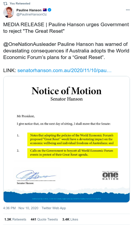 One of our politicians in the Federal Senate, controversial Pauline Hanson moved a Notice of Motion to reject the WEF’s proposed “great reset”. In the motion she urges the Australian Government led by ScoLo and the Coalition Party to boycott all future World Economic Forum events in protest of their “Great Reset” agenda.
