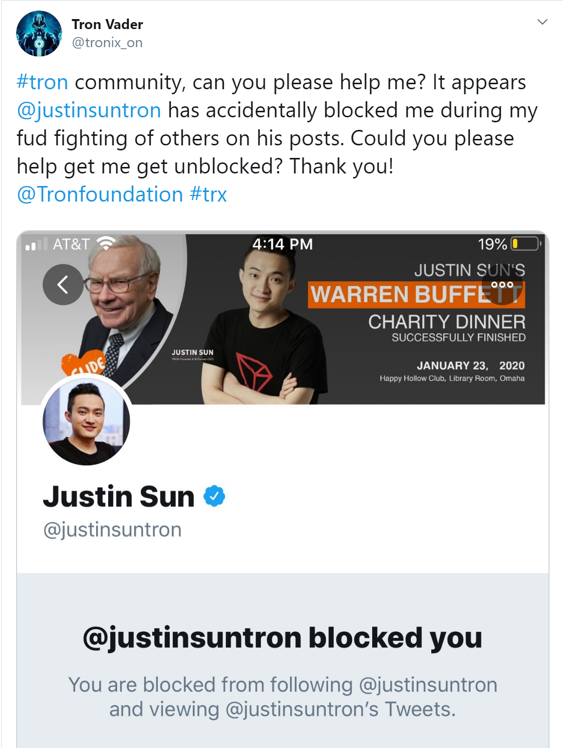 Amazingly enough Justin did not just stop at people who are critiquing his choices but blindly blocked everyone that commented at all. Note how even Tron Vader, the Tron community member and investor in Tron has been blocked as well.