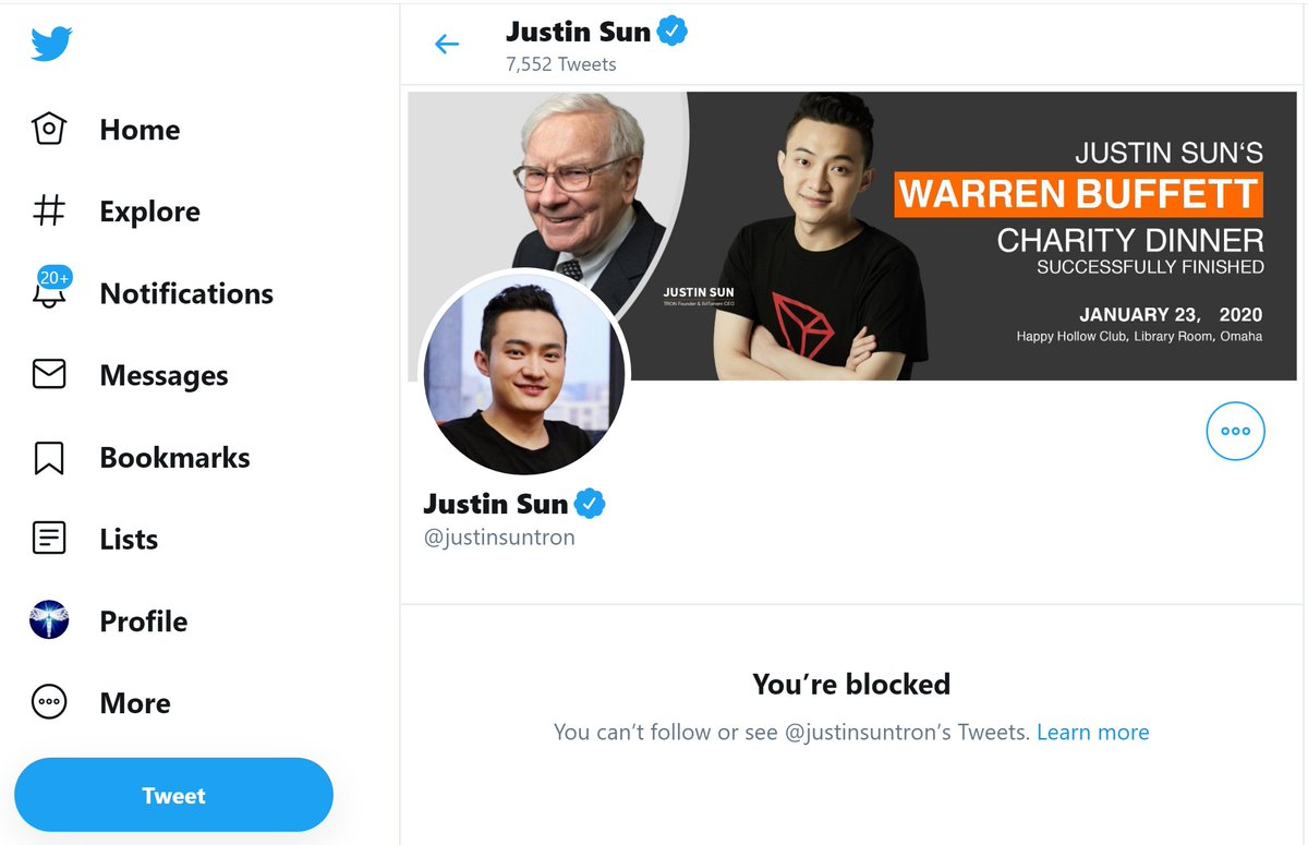 Covid-19 Response - Justin Sun practices exceptional social media "social distancing" by blocking people with contrary opinions