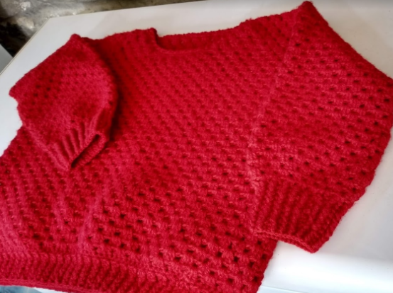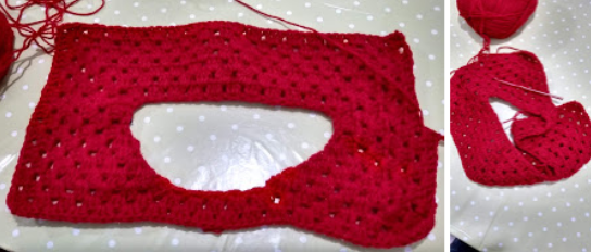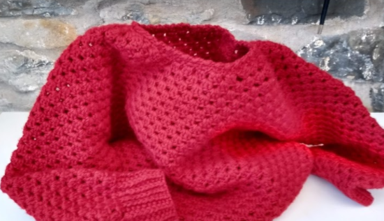 My red sweater is made using two strands of red acrylic yarn together and a 5mm hook. Right from the beginning I questioned my choice of colour - red’s never been my favourite - and my use of two strands together. I had so much of that yarn and thought this was the right use for it. The two strands made it too thick (stiff) and the hook should have been 6mm to compensate.