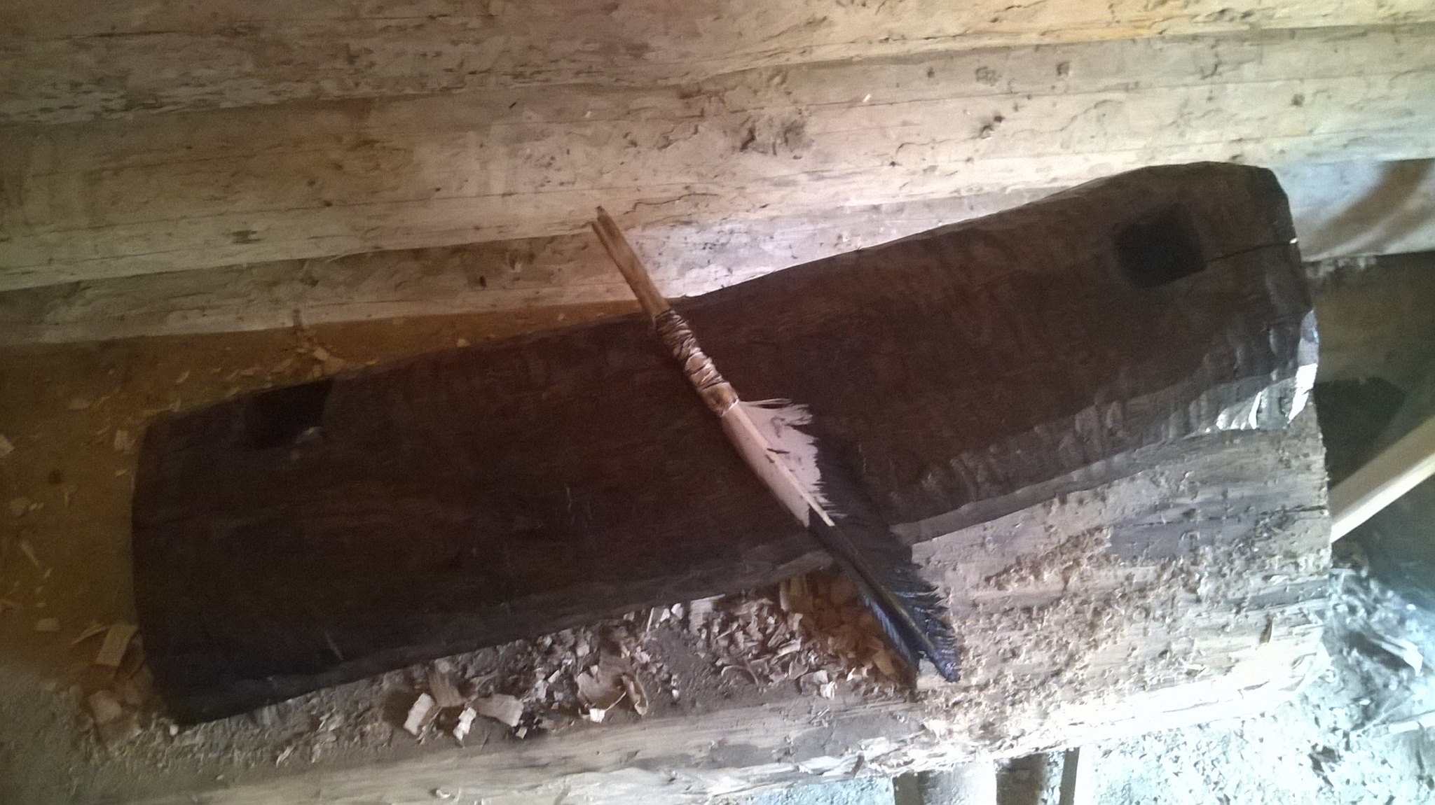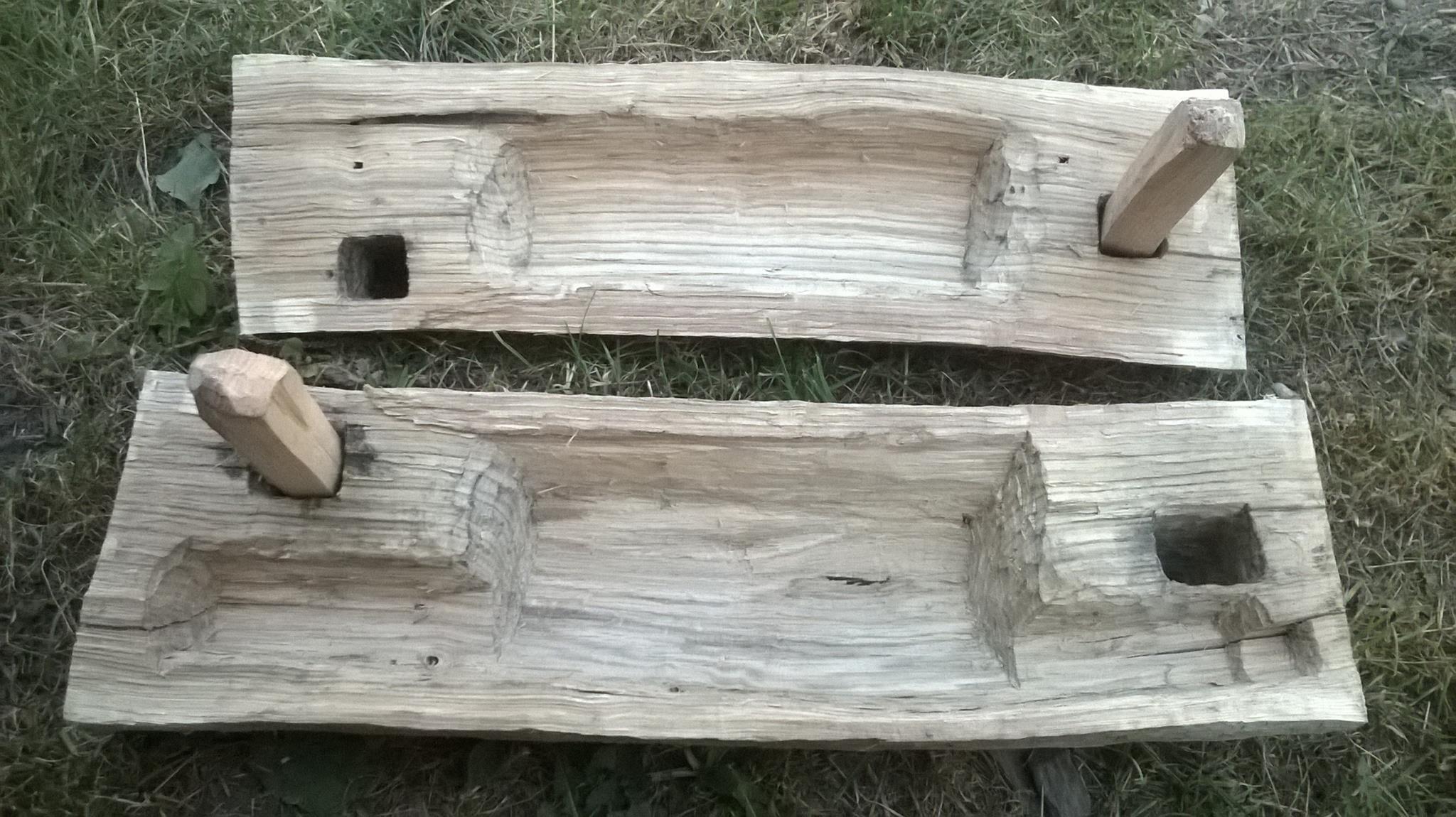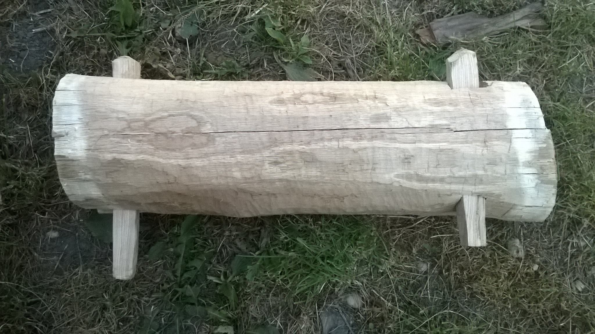 Po wydrążeniu zagłębień i otworów kłodę okorowałem, z zamiarem dalszego wykorzystania kory podczas garbowania lub farbowania tkanin. Całość zaimpregnowałem preparatem ze smoły drzewnej.