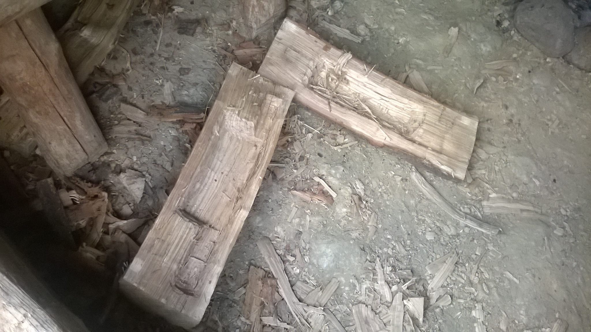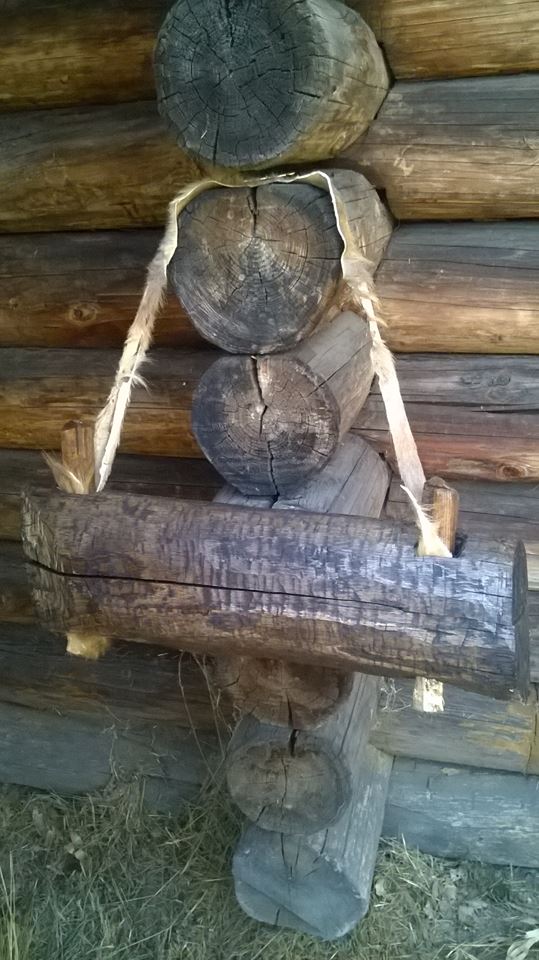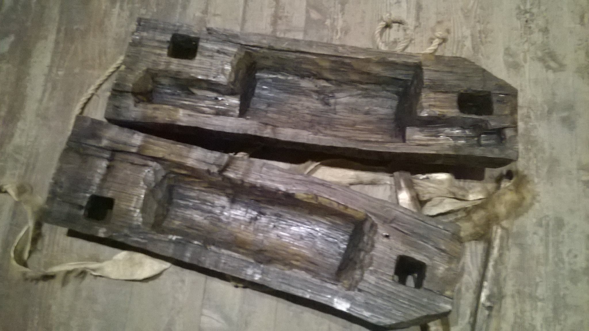 Po wydrążeniu zagłębień i otworów kłodę okorowałem, z zamiarem dalszego wykorzystania kory podczas garbowania lub farbowania tkanin. Całość zaimpregnowałem preparatem ze smoły drzewnej.